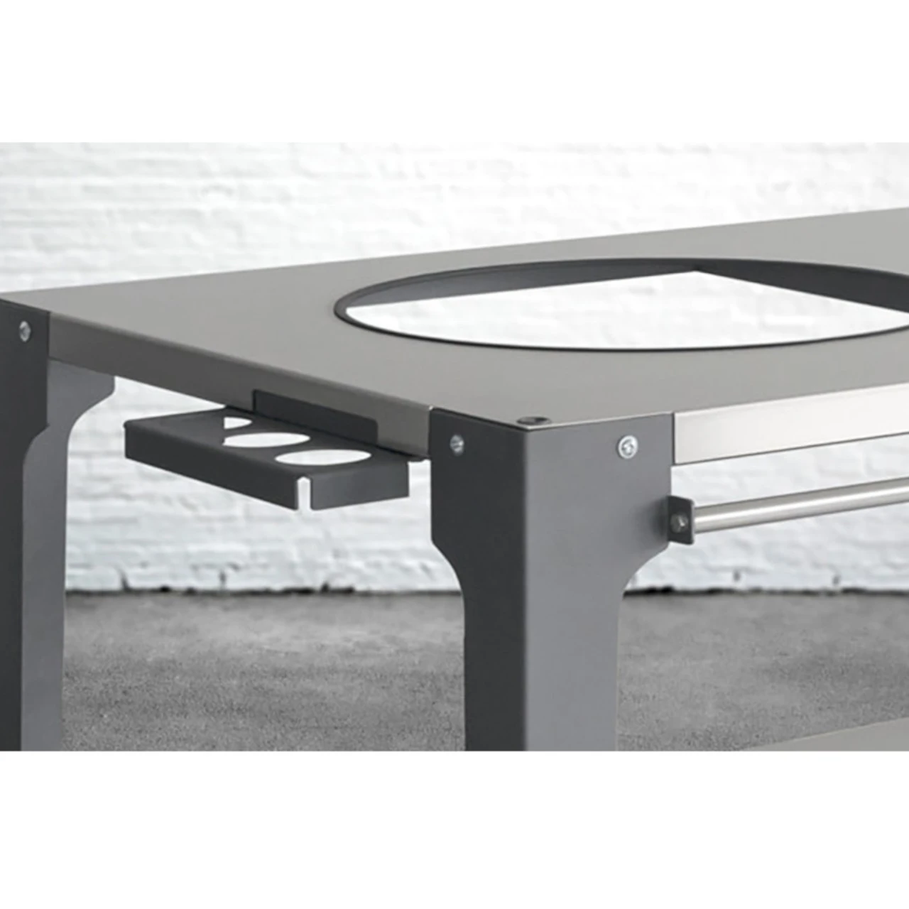 Clever kombiniert: 4-Stagioni Holzbackofen als Tabletop-Gerät auf dem stabilen Tisch aus Edelstahl. Großzügige Arbeitsfläche mit Ablage, eine Reling für Kochutensilien, seitlich angebrachte Halterungen für Feuerhaken, Besen und Backschaufel, alles jederzeit griffbereit.