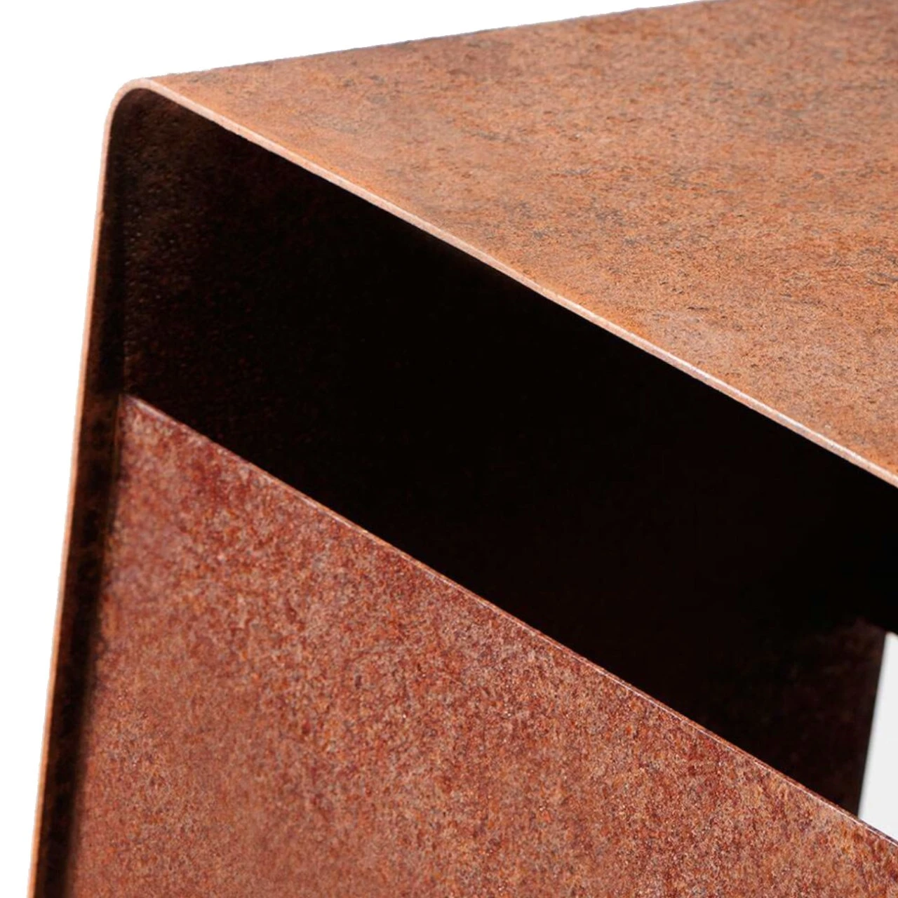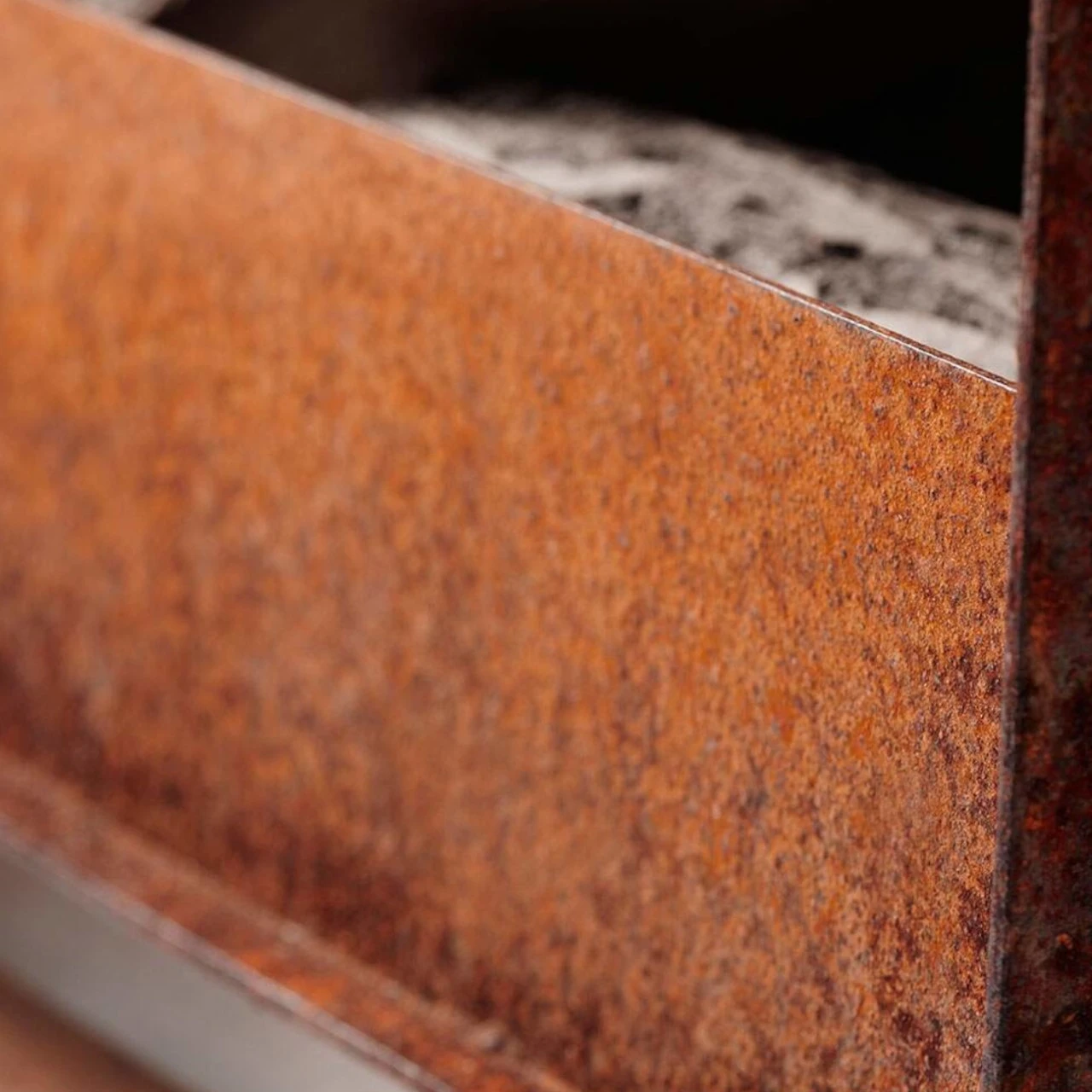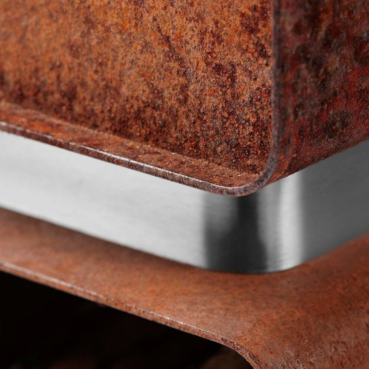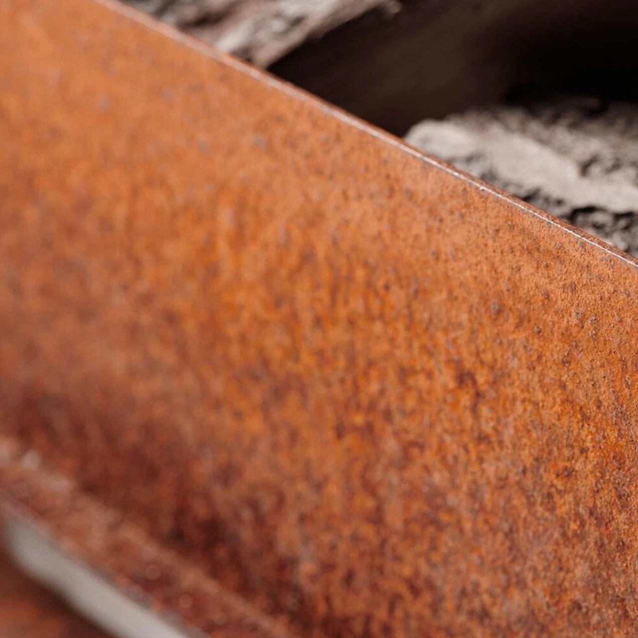 Der Alpha Gartenkamin ist aus einer Kombination von Corten- und gebürstetem Edelstahl gefertigt. Sobald sich die Patina gebildet hat, wird der Edelstahl-Abstandhalter einen erstaunlichen Kontrast zwischen der rohen Patina des Cortenstahls und der gebürsteten Oberfläche des Edelstahls schaffen – ein idealer Gartenkamin für ein modernes Zuhause.