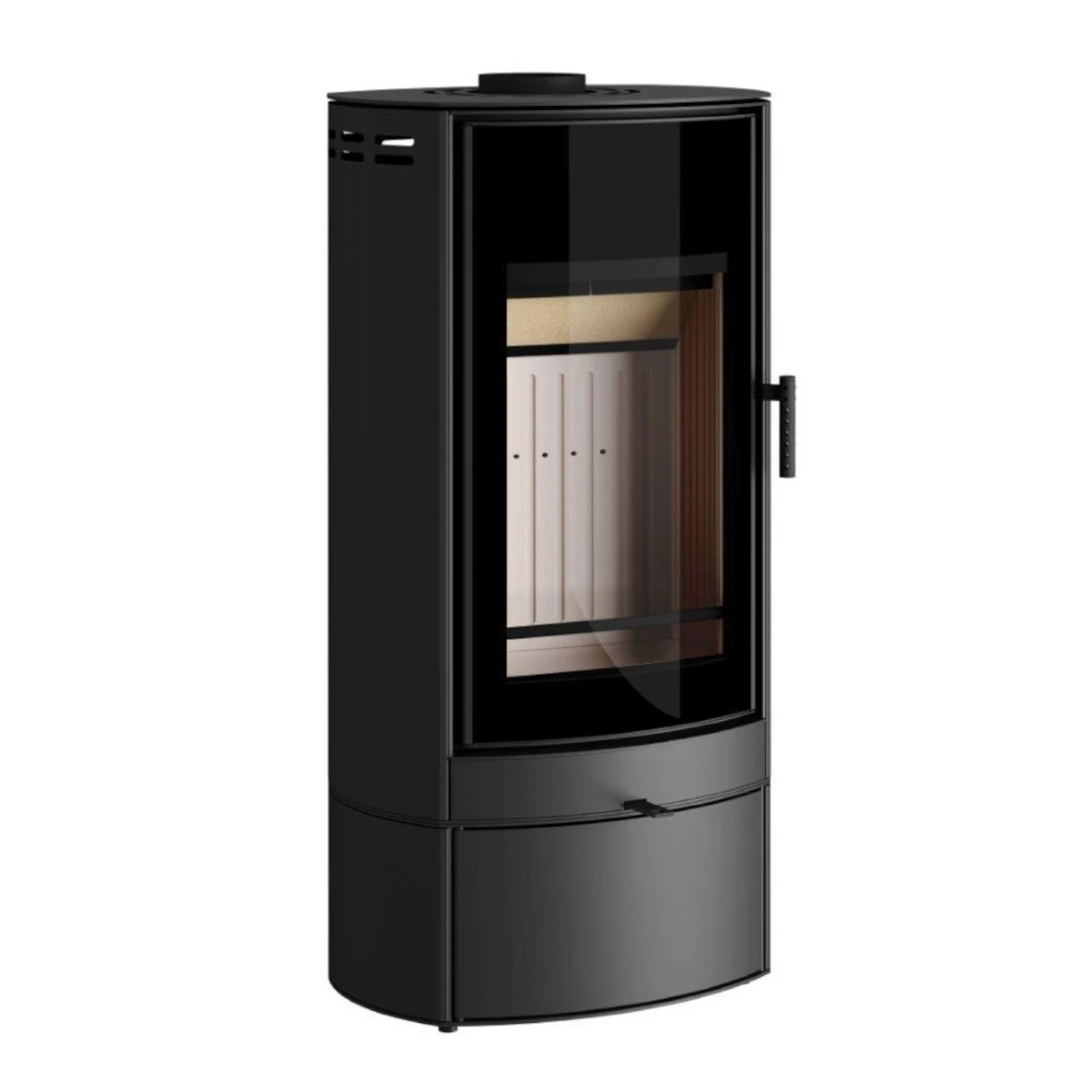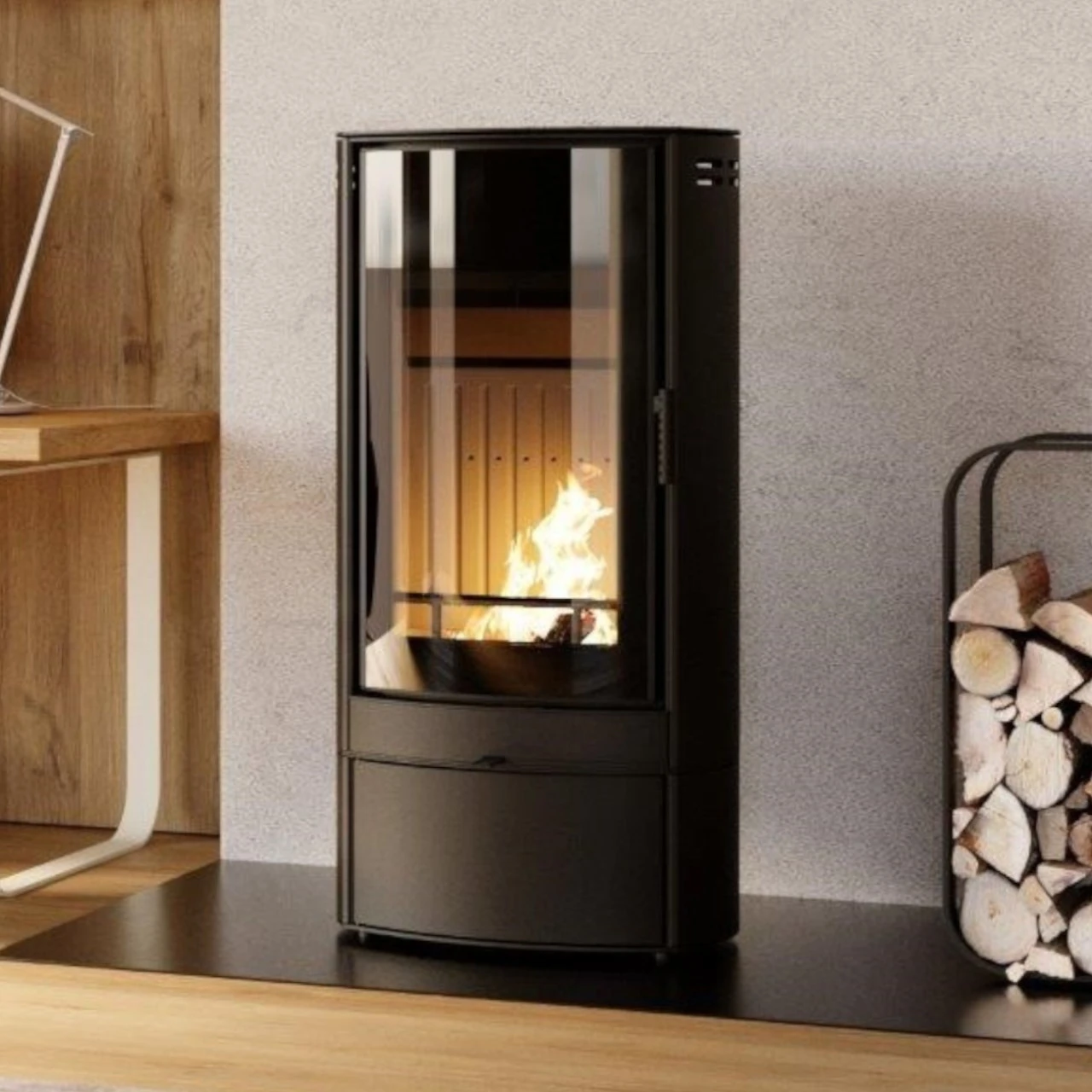 Der freistehende Kaminofen ARCO passt mit seiner schlanken und kompakten Form auch perfekt in kleinere Räume. Eindrucksvoll ist die hochgewölbte Glasscheibe, die eine schöne vertikale Sicht auf das Feuer ermöglicht. ARCO-Kaminöfen werden in drei Formen angeboten: F1 auf dezentem Trompenfuß, F2 mit Holzfach, F3 mit geschlossener Tür.