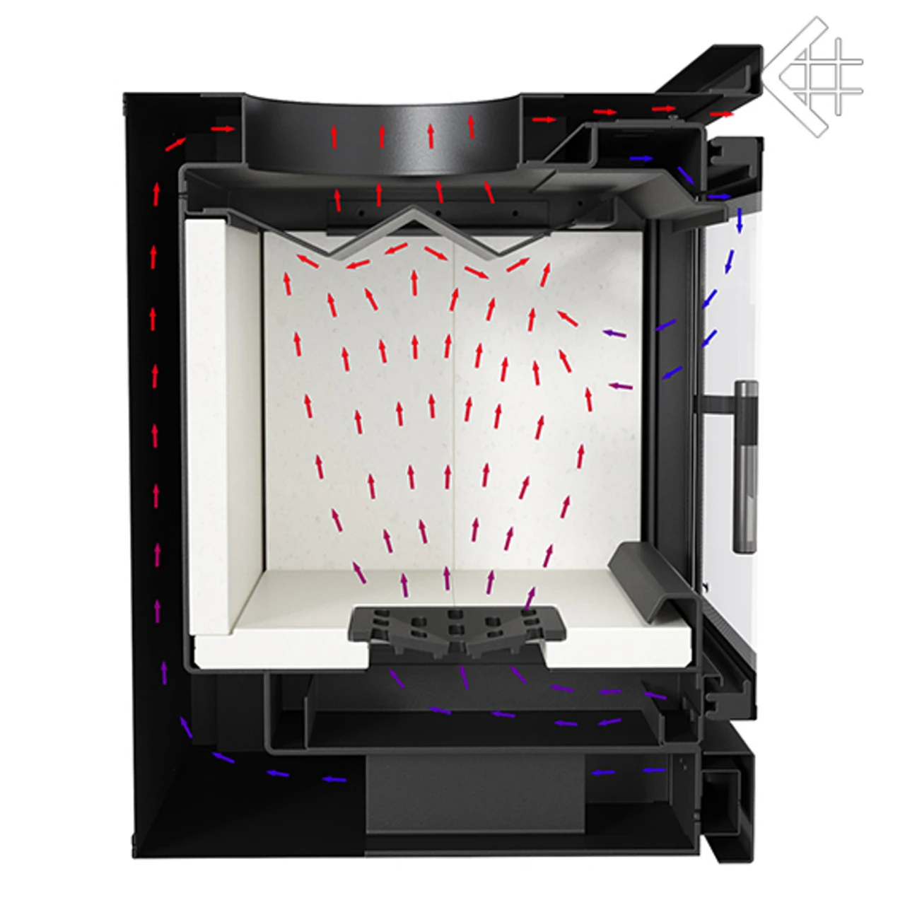 Scheibenspülung – Klare Sicht auf das Feuer – Luftstrom vor der Glasscheibe, dadurch wird die Verschmutzung der Scheibe minimiert