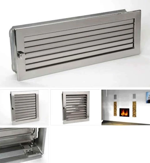 Warmluftgitter mit verstellbaren Lamellen aus Edelstahl in geschliffener oder hochglänzender Ausführung komplett mit Einbaurahmen aus verzinktem Stahlblech. Hochwertige Edelstahlgitter in geschliffener und hochglänzender Ausführung. Selbst die „Bratzen“ sind aus Edelstahl gefertigt