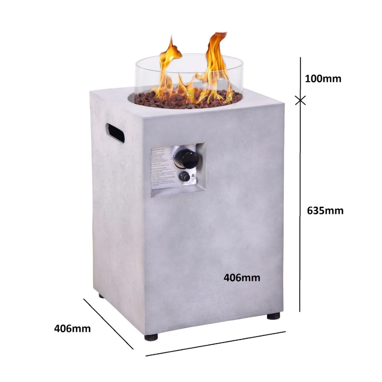 Dieser Außenkamin ist mit einer Hülle, roten Lavasteinen, einem Gasschlauch und einem Gasdruckregler ausgestattet.