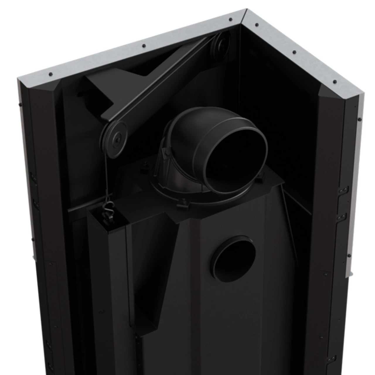 Die Primärluft wird dem Einsatz von außen zugeführt, dank des eingebauten 125 mm Lufteinlassanschlusses. Der Luftansaugstutzen befindet sich im Boden des Einsatzes. Die Einstellung erfolgt über eine eingebaute Drosselklappe, die von einem Regler unter der Tür eingestellt wird. Der gesamte Mechanismus arbeitet im Kamin, sehr leise und störungsfrei.