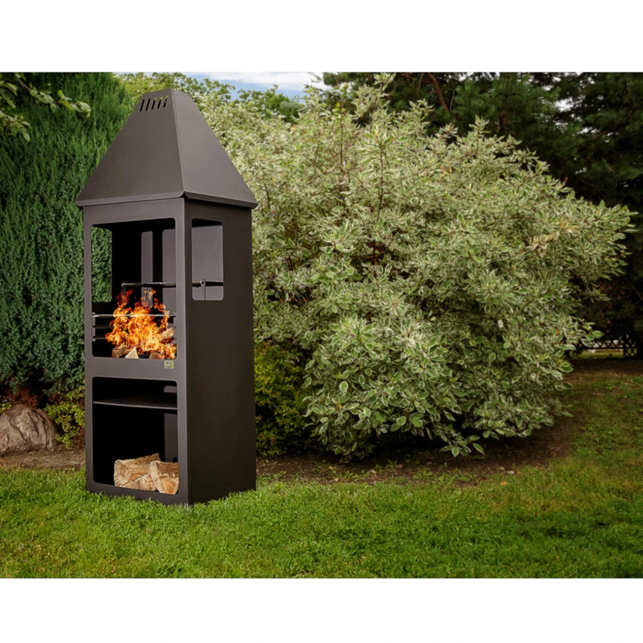 Das mitgelieferte Feuerrost ist sowohl für Holzkohle als auch für kleine Holzscheite geeignet und leicht zu reinigen. Die Holzscheite können Sie im dafür vorgesehenen Holzfach aufbewahren über der noch eine praktische Ablage für Grillzubehör und Werkzeug eingebaut ist.
