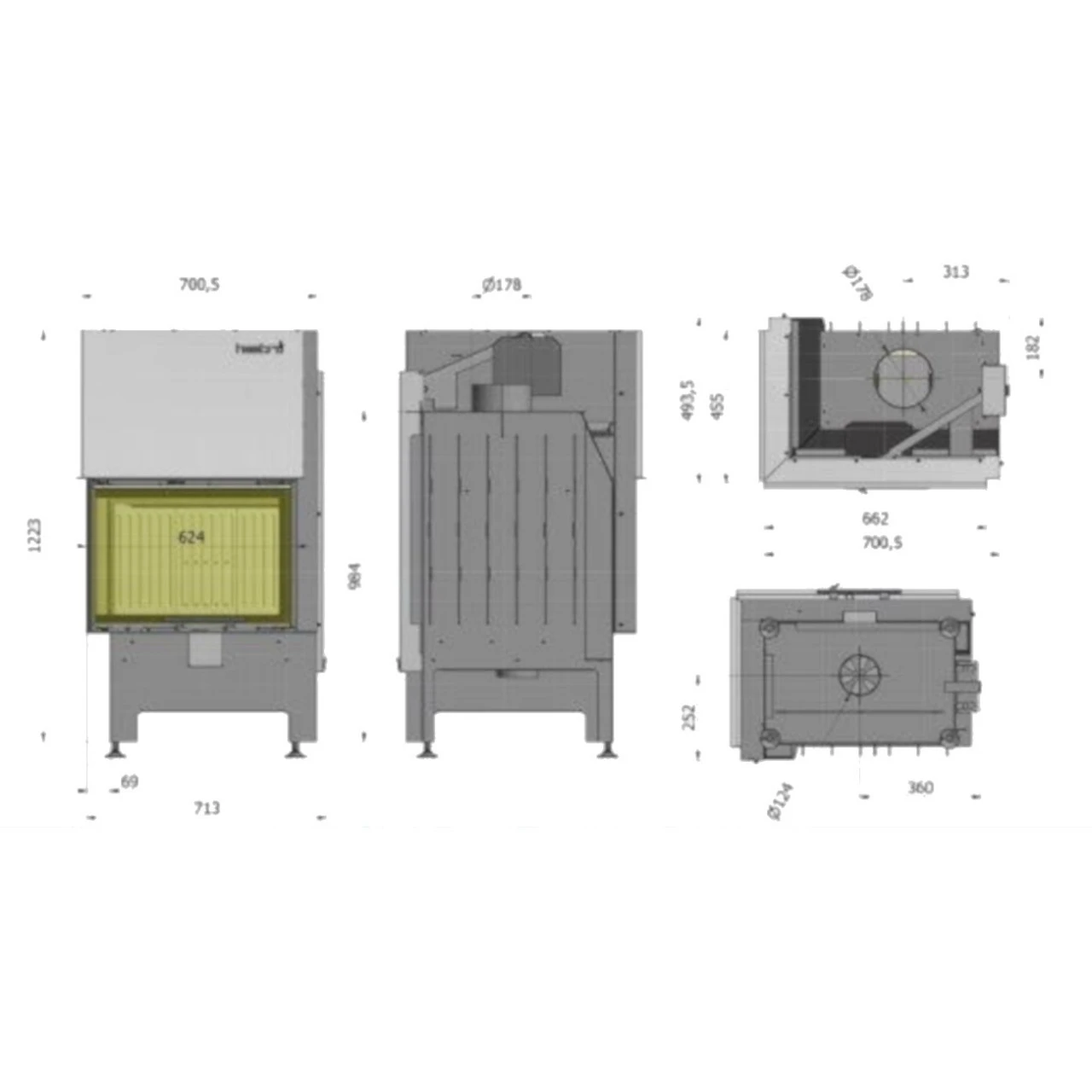 Der Feuerraum ist mit einer 3 cm starken Keramik-Auskleidung in schwarz ausgestattet. Der Kamineinsatz verfügt über eine Tür mit einem ergonomischen und belüfteten Öffnungsgriff aus Edelstahl in schwarz lackiert und ist für eine langfristige, störungsfreie und ökonomische Nutzung gebaut.