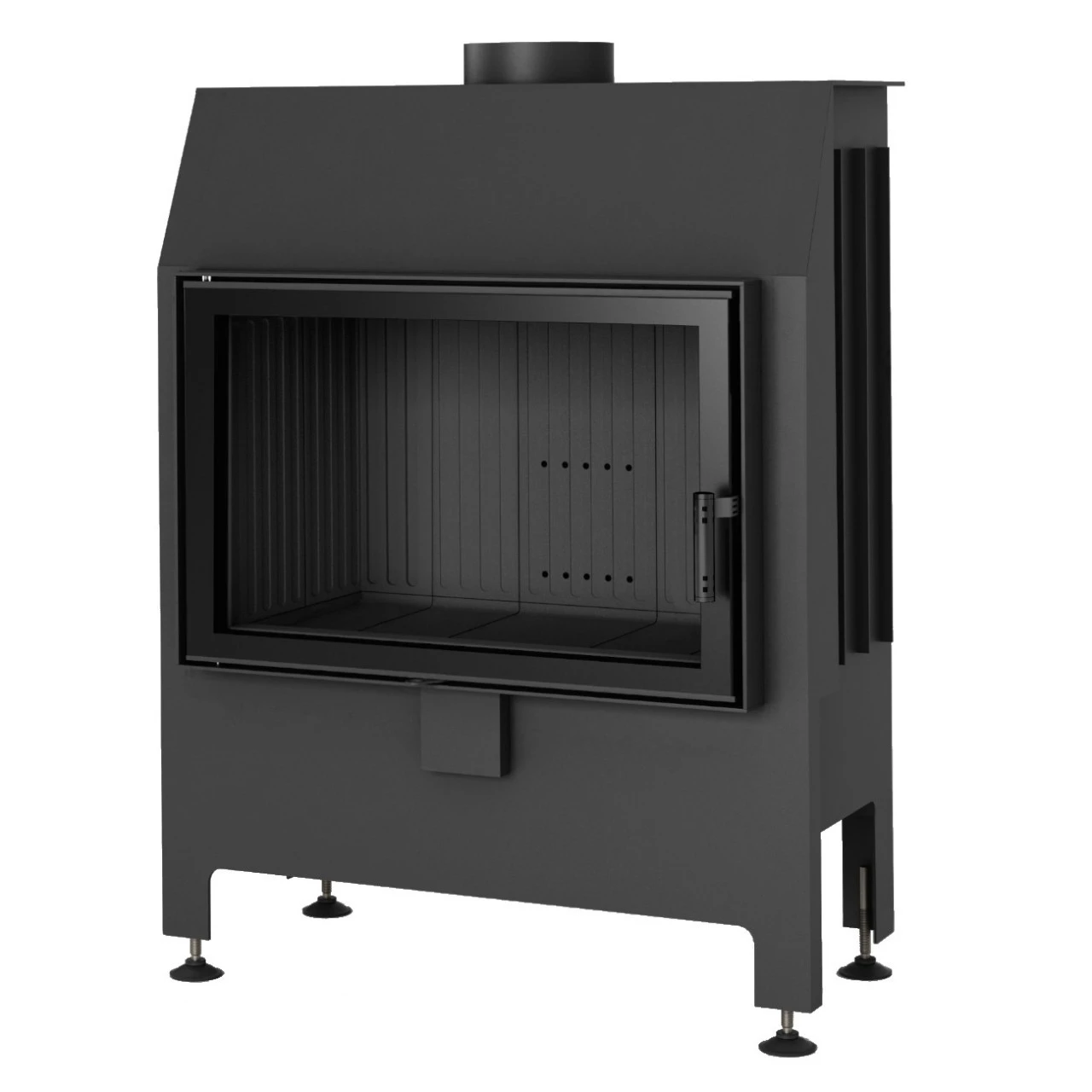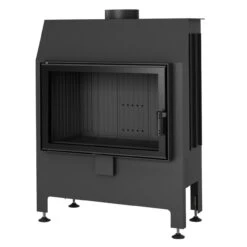 Der Feuerraum ist mit einer 3 cm starken Keramik-Auskleidung in schwarz ausgestattet. Der Kamineinsatz verfügt über eine Tür mit einem ergonomischen und belüfteten Öffnungsgriff aus Edelstahl schwarz lackiert und ist für eine langfristige, störungsfreie und ökonomische Nutzung gebaut.
