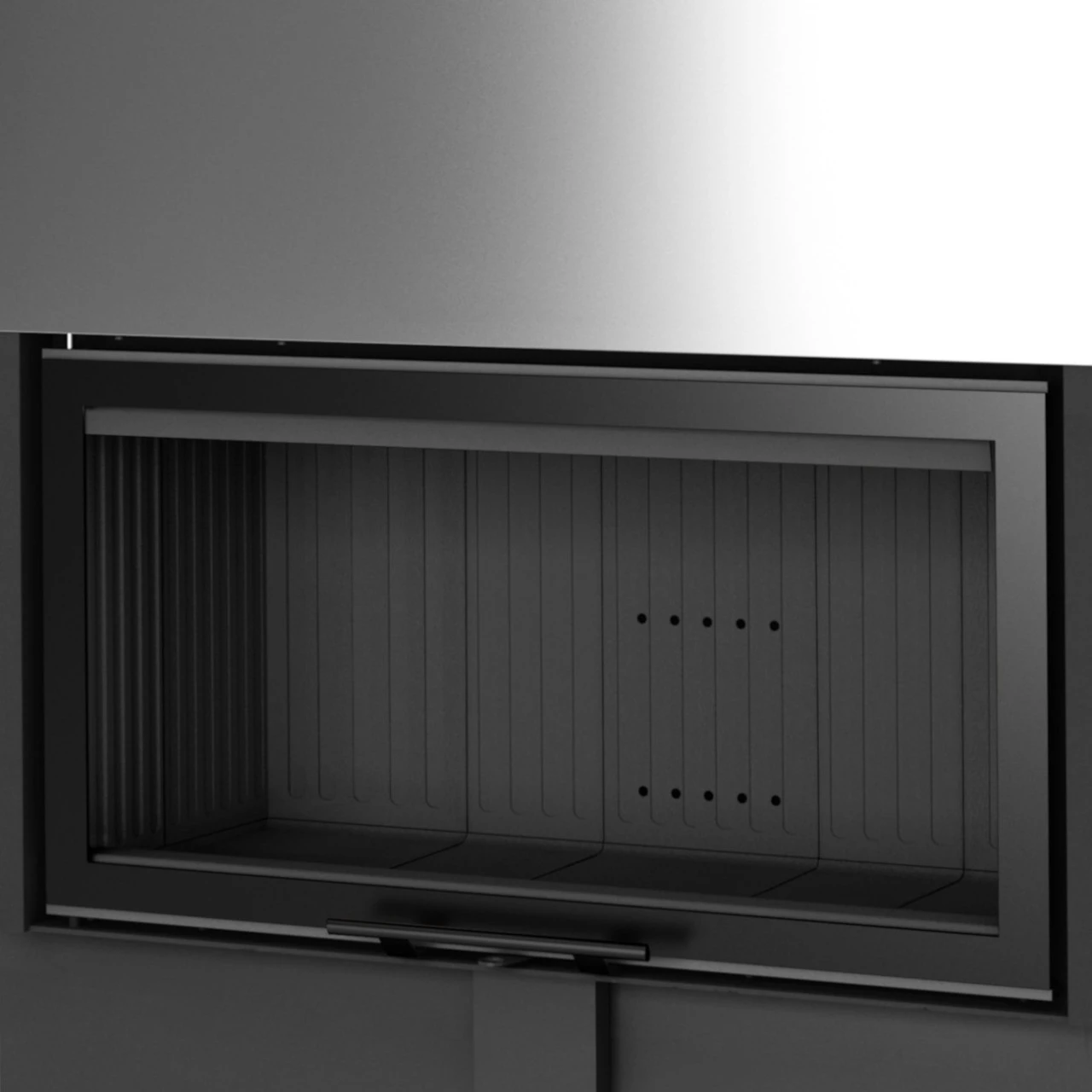 Der Feuerraum ist mit einer 3 cm starken Keramik-Auskleidung in schwarz ausgestattet. Der Kamineinsatz verfügt über eine Tür mit einer ergonomischen und belüfteten Öffnungsgriffstange aus Edelstahl schwarz lackiert und ist für eine langfristige, störungsfreie und ökonomische Nutzung gebaut.