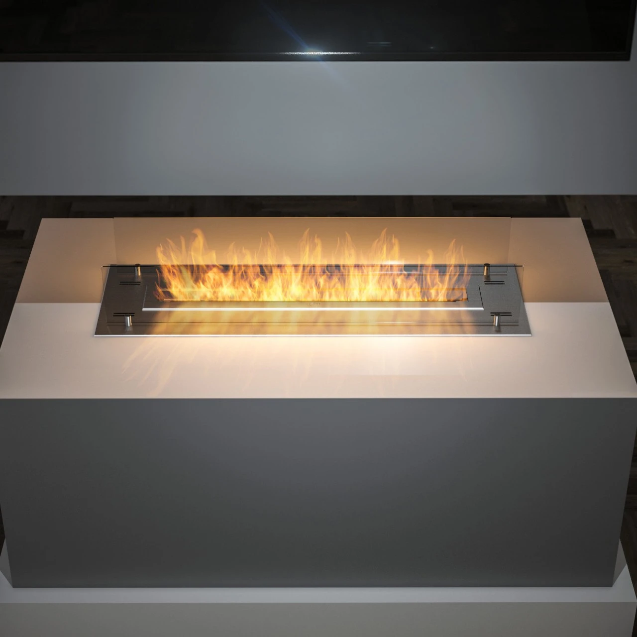 Der INSERT 1000 Ethanolkamin mit einem 800 mm großen Brenner ist ein fertiger Satz, der beispielsweise in einem Schränkchen montiert werden kann. Dank seiner Konstruktion nimmt eine Einlage die Wärme des Brenners auf, wodurch die Oberfläche beispielsweise eines Schränkches nicht zu heiß wird. Die Einlage hat auch ein Entlüftungssystem, das verhindert, dass Druck unter dem Brenner entsteht, wenn Kraftstoff überläuft.