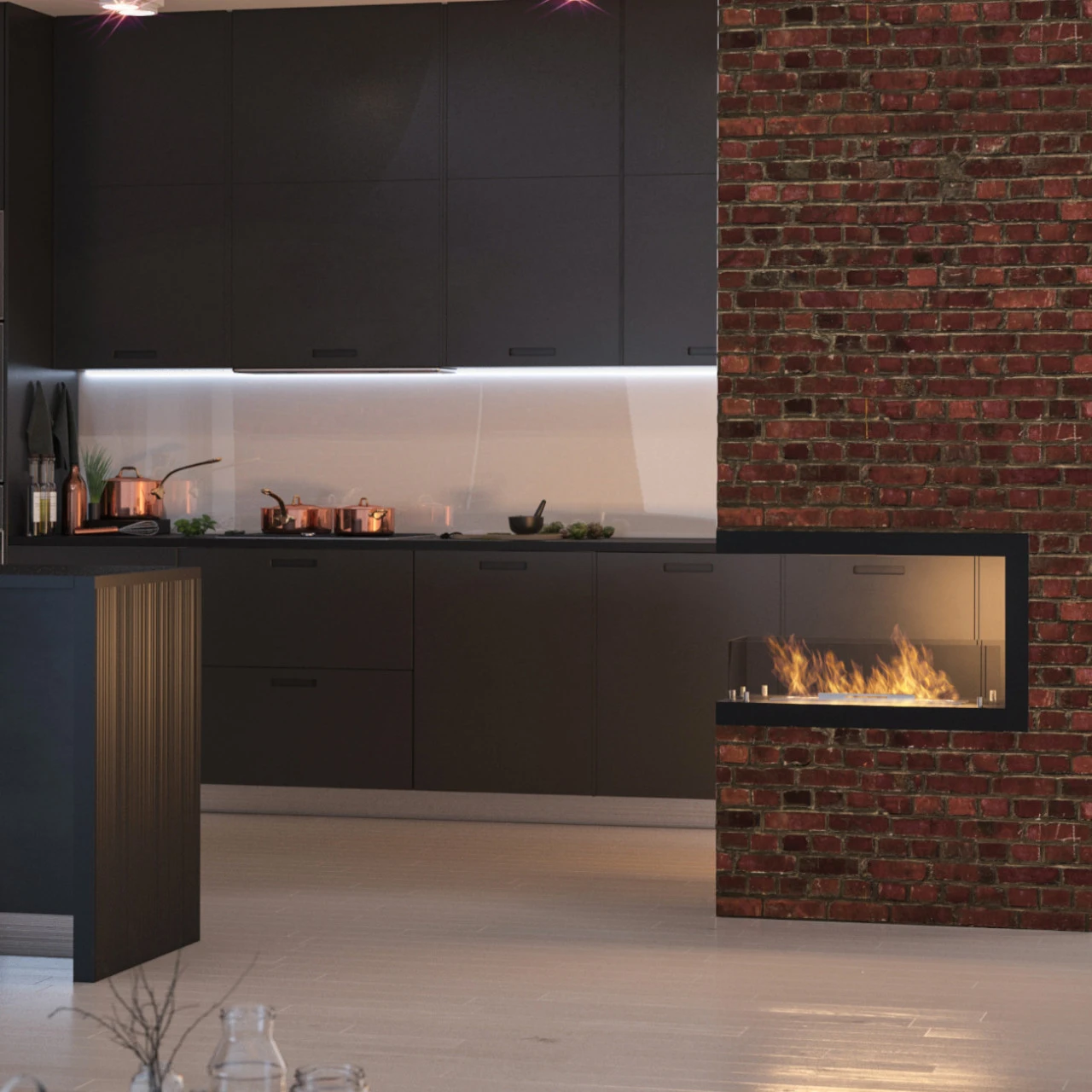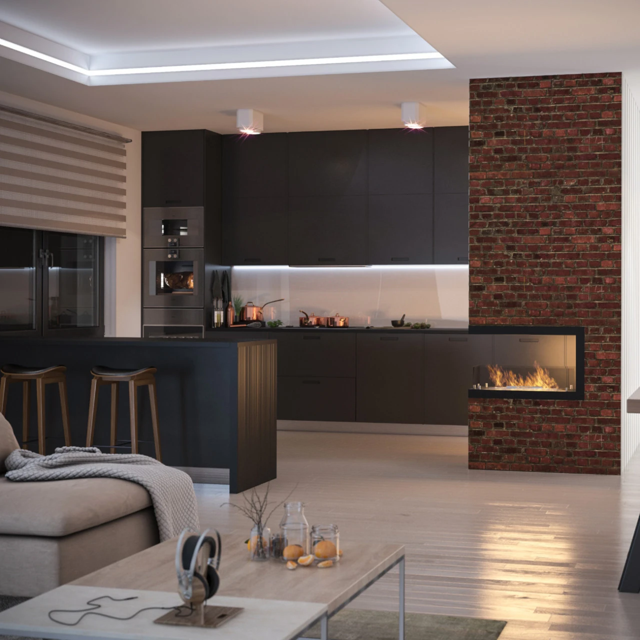 Das Modell INSIDE U 800 ist ein Panorama Kamin, der in einer vorbereiteten Nische montiert werden kann. Der Kaminrahmen enthält ein Belüftungssystem, das verhindert, dass Druck unter dem Brenner entsteht, wenn der Kraftstoff überläuft. Der Rahmen ist außerdem mit 3 Scheiben ausgestattet, die in spezialen Schienen eingesetzt worden sind, sodass Sie alle Befestigungen ausblenden können. Der Kaminrahmen verfügt außerdem über eine eingebaute Isolierung, die eine sichere Montage z. B. in MDF- oder Gipskartonkonstruktionen ermöglicht. Der Kamin kann eine schöne und effektive Verbindung zwischen zwei Räumen darstellen.