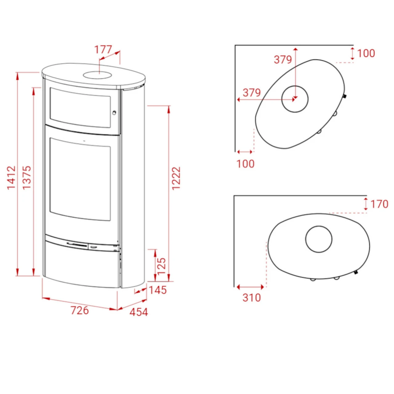 - Abstand von Mitte des Rauchstutzens bis zur Hinterkante des Ofens: 17,7 cm;