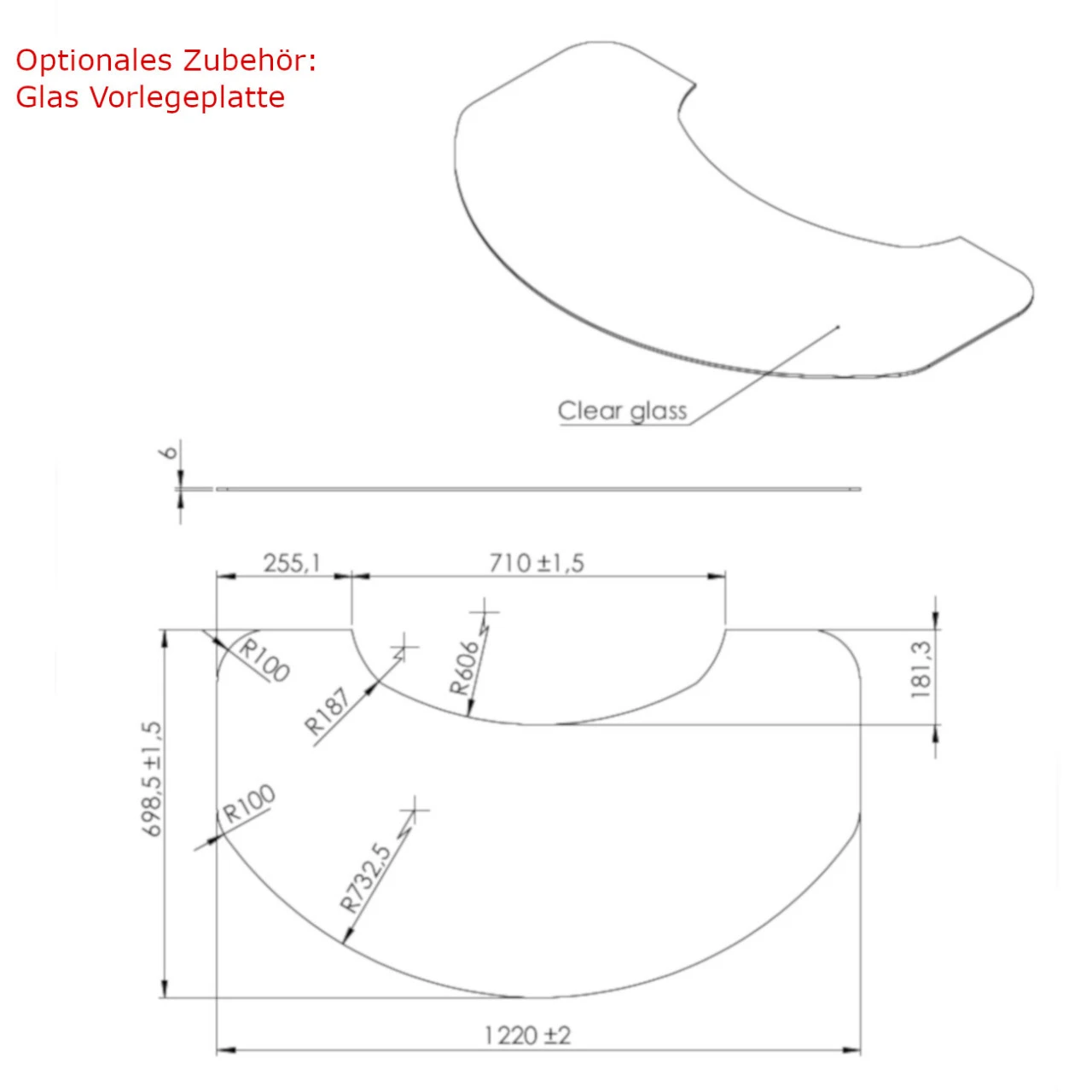 - Passgenaue Glas Vorlegeplatte (Achtung: Vorlegeplatte nur in Verbindung mit der Montage der Stellfüße)