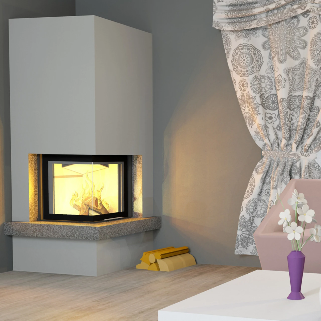 Modell: Hajduk Smart 2LTH Warmluft-Eckkamineinsatz Linksverglast, rahmenlose Hebetür mit einteiligem Glas (die Tür lässt sich zum Reinigen als schwenktür öffnen)