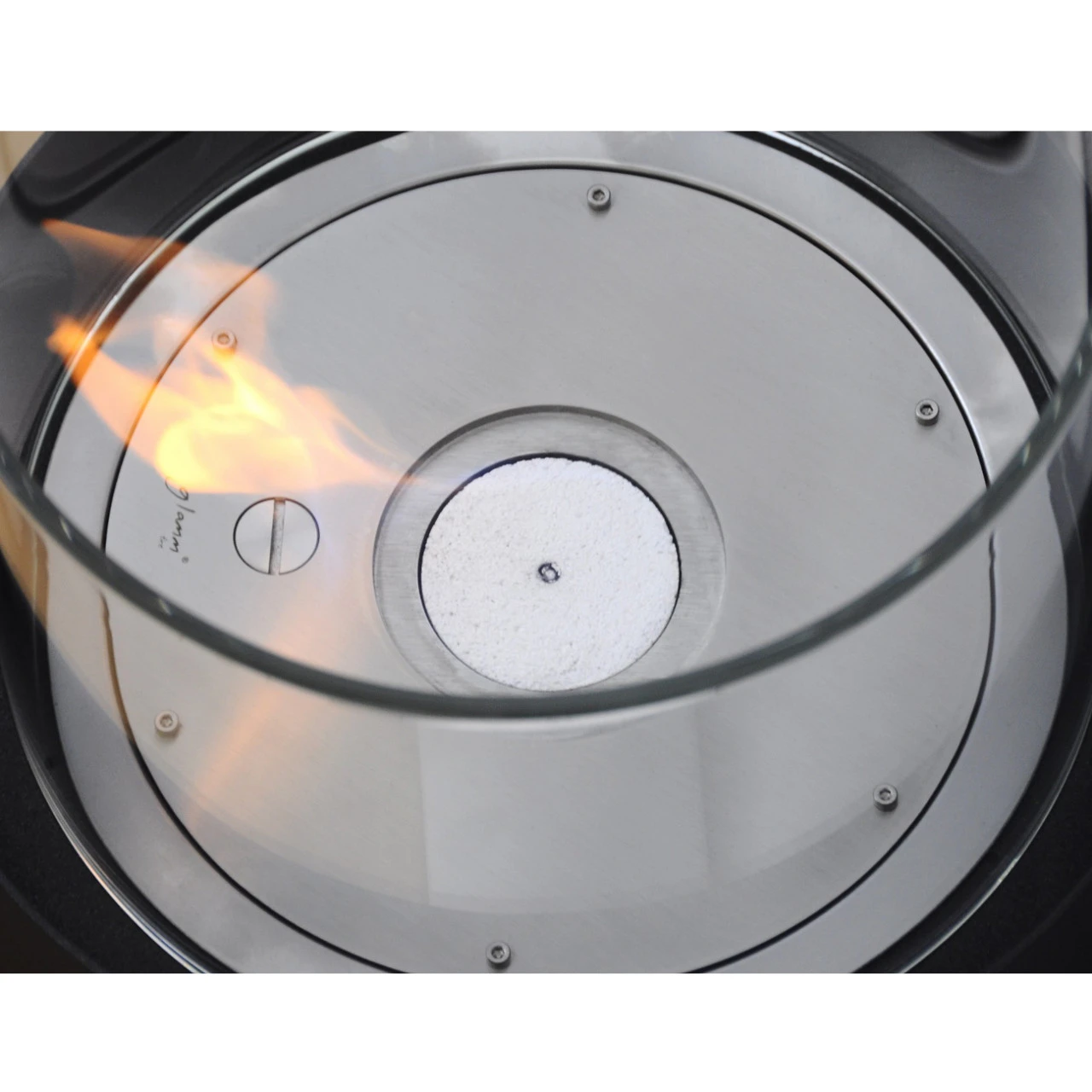Schutzglas Klein: hochtemperaurbeständiges Rundglas mit Glashalterung (Maße: 31,5 Ø cm x 10,0 cm; Gewicht: 2 kg + 1 kg)