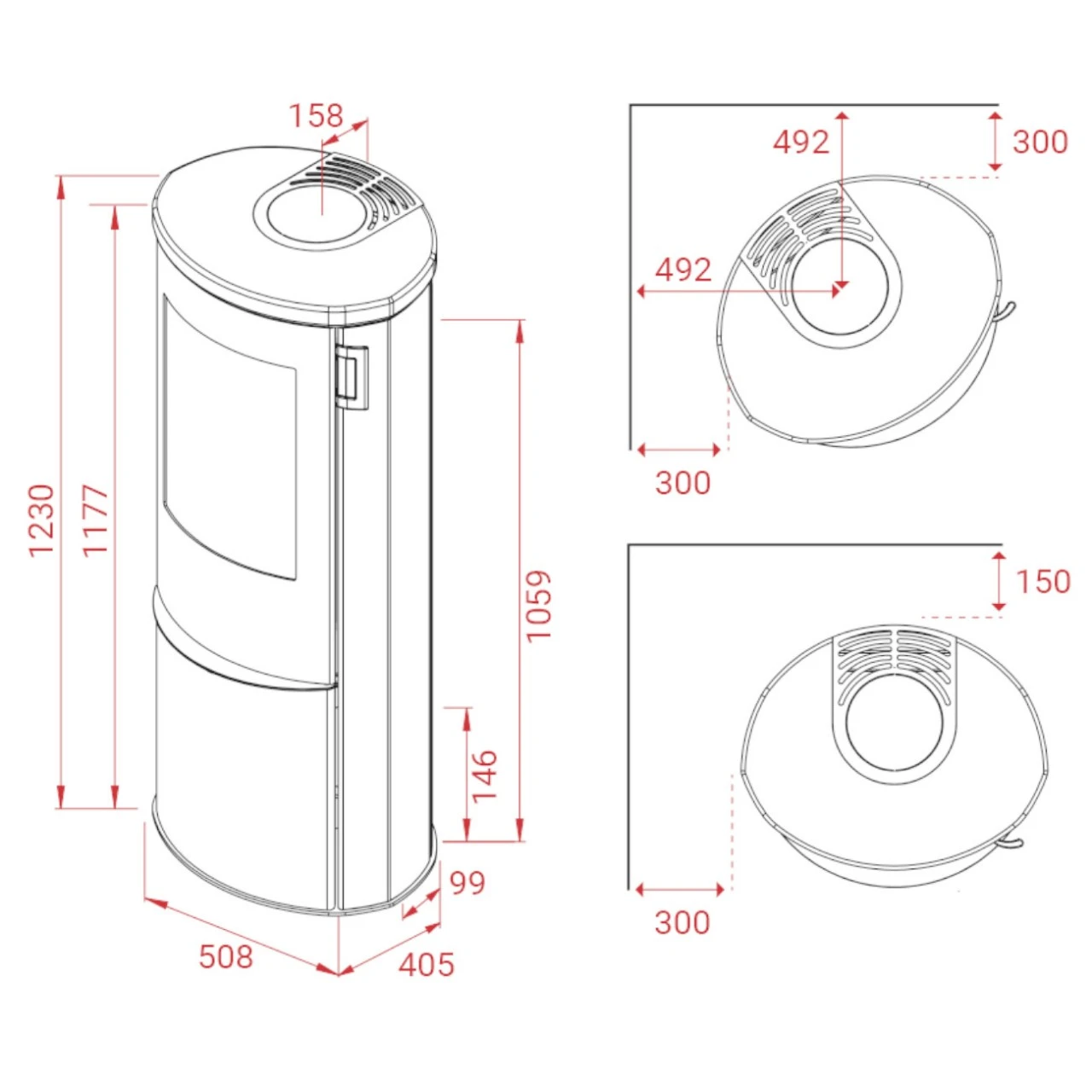 - Abstand von Mitte des Rauchstutzens bis zur Hinterkante des Ofens: 15,8 cm;
