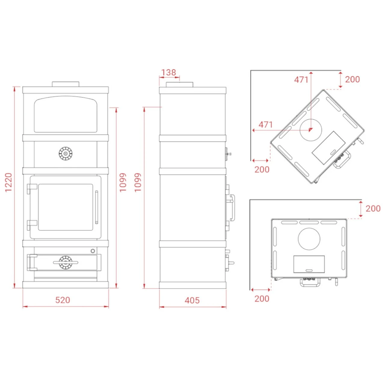 - Abstand von Mitte des Rauchstutzens bis zur Hinterkante des Ofens: 13,8 cm;