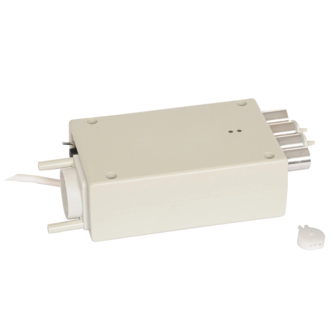 Über einen Luftschlauch (2x) strömt die Außenluft über die Anschlussnippel und die Filter zum Differenzdruckschalter, der sich im Innenbereich des Gebäudes, zusammen mit der 230 V-Steckdose im P4-Gehäuse befindet.