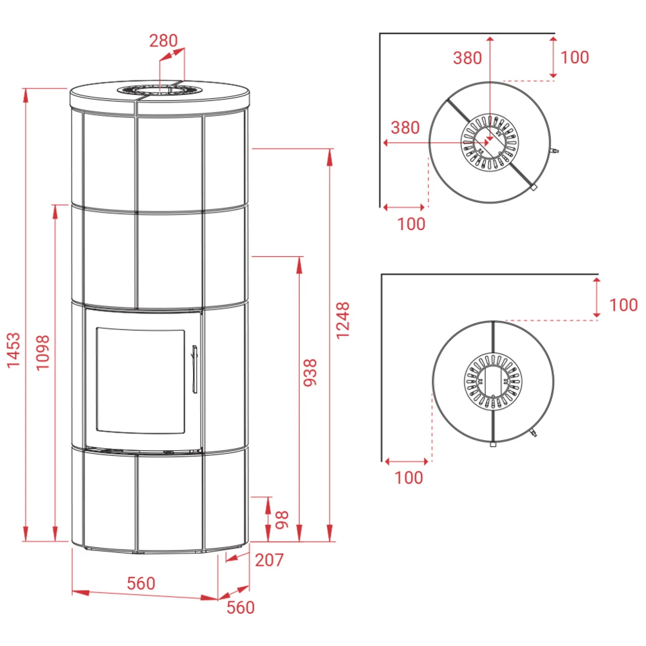 - Abstand von Mitte des Rauchstutzens bis zur Hinterkante des Ofens: 28,0 cm;