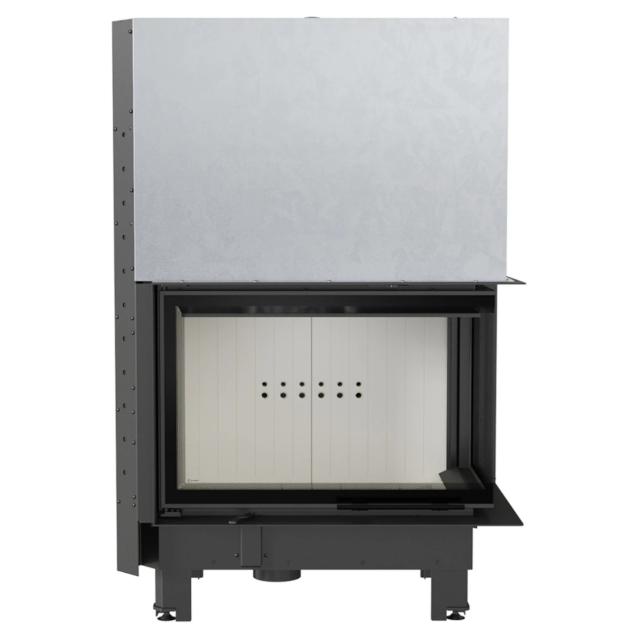 Modell: Kratki MBA 17 Warmluft-Eckkamineinsatz mit Hebetür und Rechtsverglast – Die Hebetür lässt sich zum Reinigen auch anders öffnen.