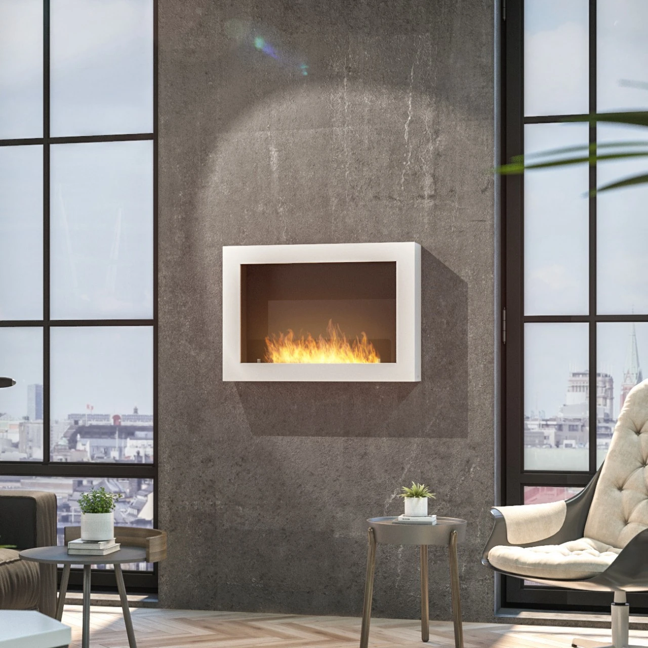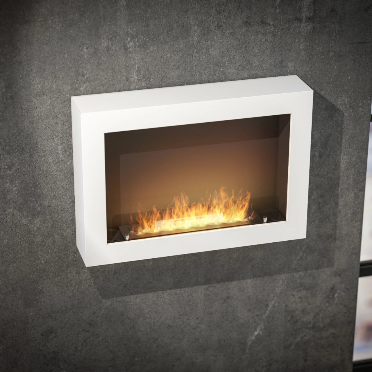„Das Modell Murall ist ein Kamin, der mit zwei Montagestiften an die Wand gehängt wird. Es kann nicht an Wänden aus Spanplatten, Möbeln, Gipskartonplatten oder an Wänden mit Tapeten verwendet werden. Die ausgearbeitete Form des Kamins Murall, seine Wärme und magische Atmosphäre verursachen, dass er jeden Raum ideal bereichert. Durch die Möglichkeit, Farbe und Größe des Kamins zu verändern (bitte sprechen Sie uns hierzu an), kann der Kamin an den Charakter jedes Innenraumes angepasst werden! Das Modell Murall ist mit einer getönten Scheibe ausgestattet, die in den Kamin eingesetzt wird. Dies erhöht die Nutzungssicherheit und macht das Feuer außergewöhnlich attraktiv. Die Konstruktion des Kamins, ausgearbeitete Details und eingebaute Seitenwände lassen den Kamin aus jeder Perspektive gut aussehen.„