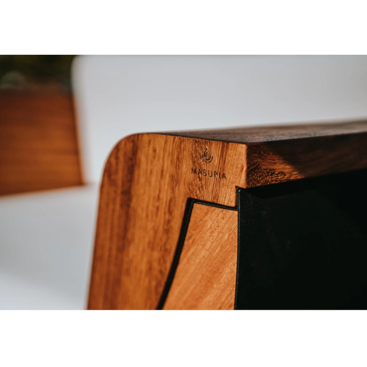 Der Couchtisch Narie ist die perfekte Ergänzung zur gesamten Kollektion MASURIA Möbel. Lange Abende im Licht der Flammen mit Freunden bei einer Tasse Lieblingskaffee oder einem Glas Wein bekommen eine zusätzliche Stimmung. Dieses Möbelstück ist eine Kombination aus hochwertigem exotischem Holz und rostfreiem Stahl oder Cortenstahl. Die Holzplatte und Konstruktion sind auf Metallfüßen gestützt, die dem Couchtisch mehr Leichtigkeit verleihen. Der Freiraum unter der Platte kann als praktische Lösung für die Lagerung von Holz dienen.