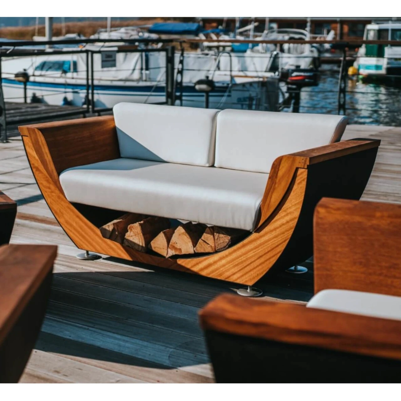 Das Sofa präsentiert sich von jeder Seite effektvoll und harmoniert perfekt mit der Umgebung. Dieses Möbelstück ist eine Kombination aus hochwertigem exotischem Holz und Edelstahl oder Cortenstahl, was die Witterungsbeständigkeit erhöht.