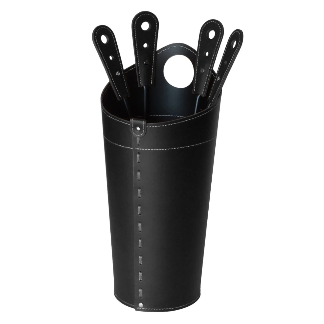 Material Kaminbesteck: Regeneriertes Leder und Schwarz lackierter Stahl