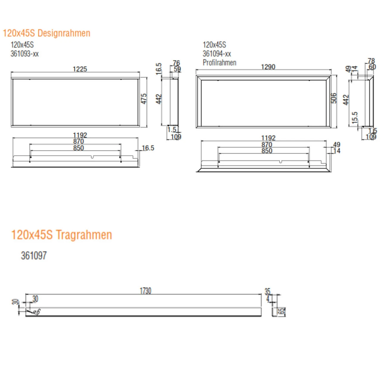 Weitere Maße finden Sie bei den Bildern und im Downloadbereich im Datenblatt (Achtung! Zeichnungen inkl. Konvektionsmantel und Designrahmen)