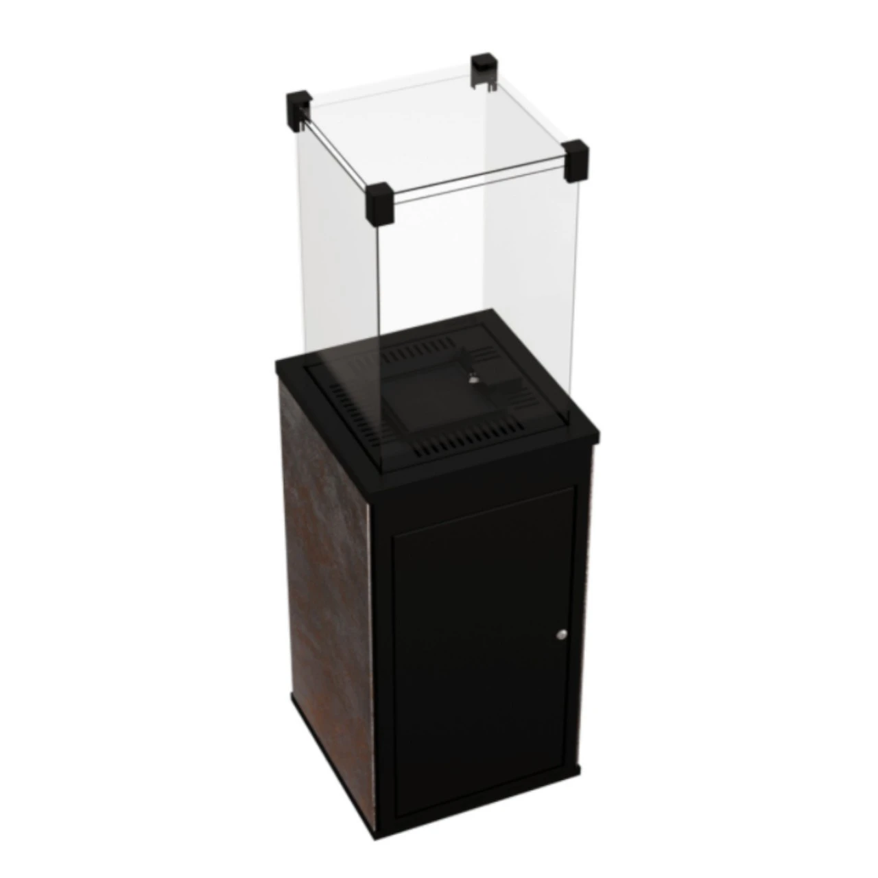 Das untere Teil des Gehäuses besteht aus Stahl und wird von drei schwarzen Glaspanelen ummantelt. Die vierte Seite ist mit einer Stahl Tür mit Schloss ausgestattet und beim Patio Mini mit einer Stahl Aushägetür.