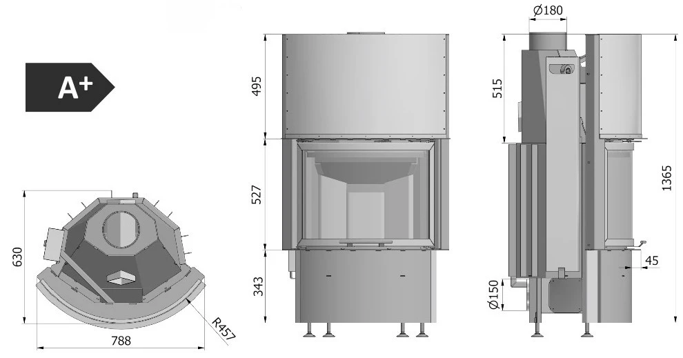 – Warmluftmantel: Bietet Ihnen die Möglichkeit die Warmluft in 2 weitere (Neben)Räume umzuleiten. Durchmesser abgehender Ausgänge: 125 mm