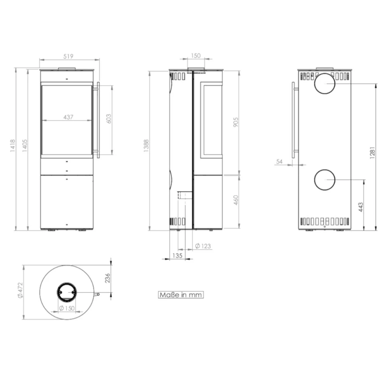 - Drehteller 180° drehbar – Erhöhung von 2,8 cm – Kaminofen nur Raumluftabhängig zu betreiben – Rauchrohranschluss nur oben möglich