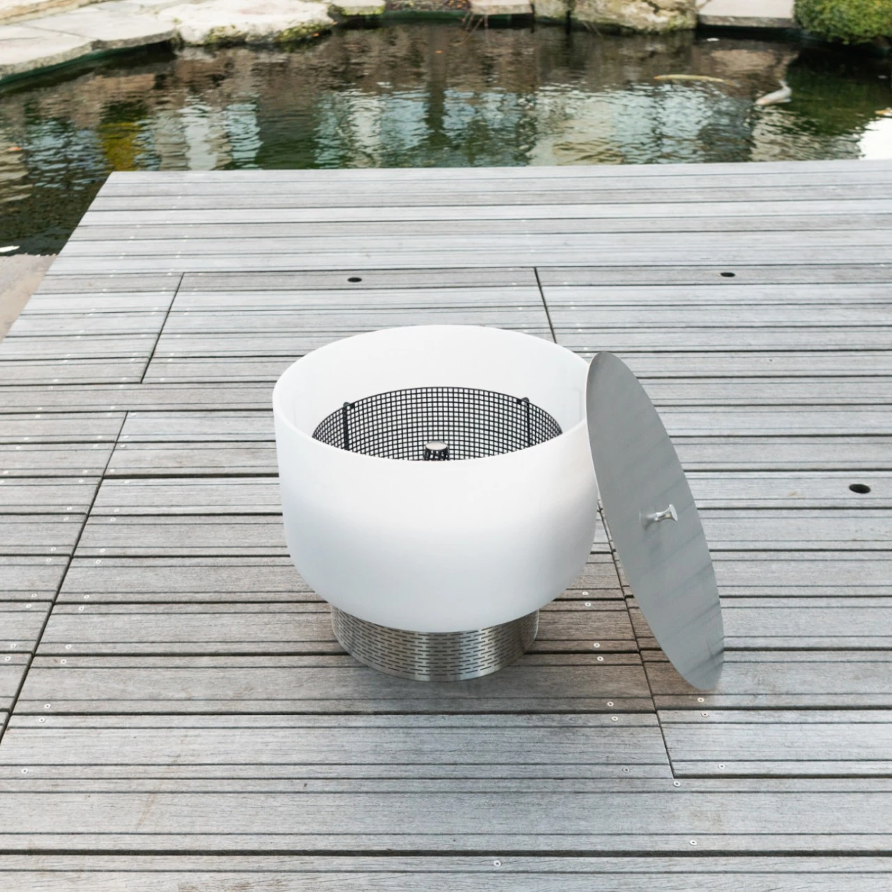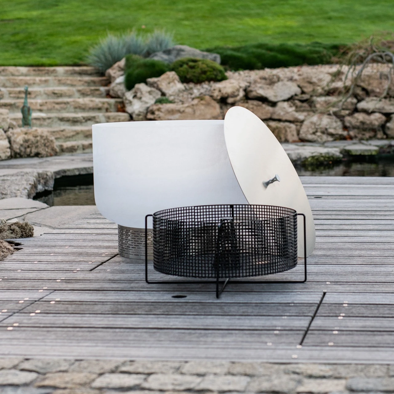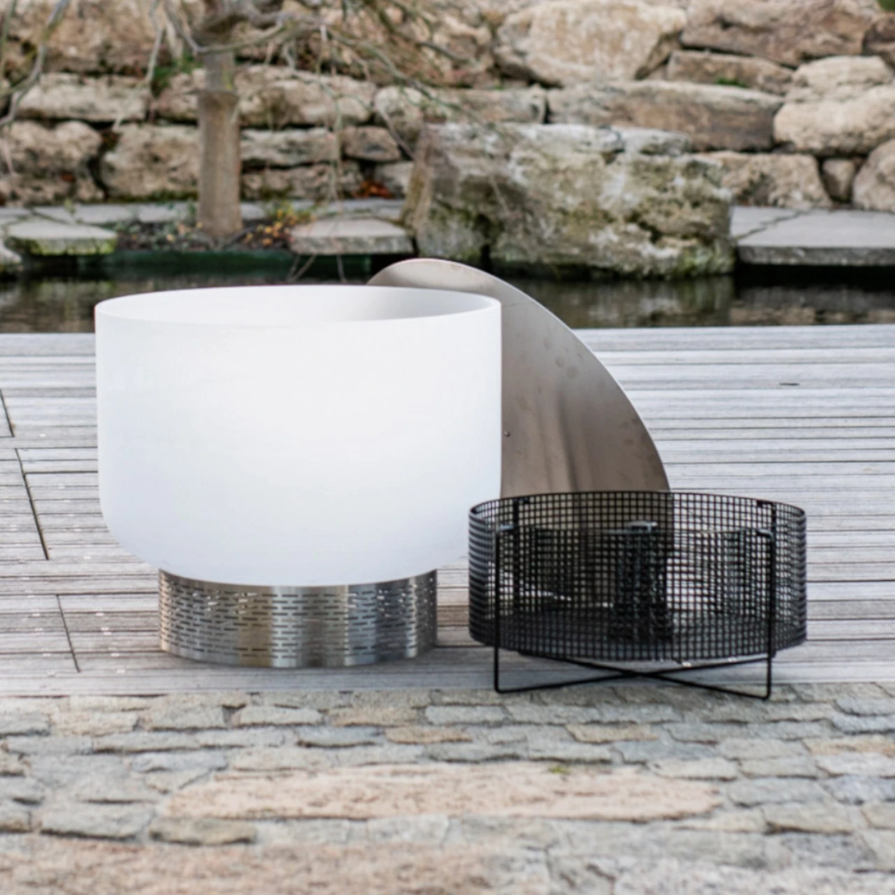 Zum Auslöschen der Flamme und zum Schutz der Glasfeuerschale dient der passgenaue Edelstahl-Deckel „QLid” mit einem Durchmesser von 54 bis 75 cm aus rostfreiem, seidenmatt geschliffenem Edelstahl.
