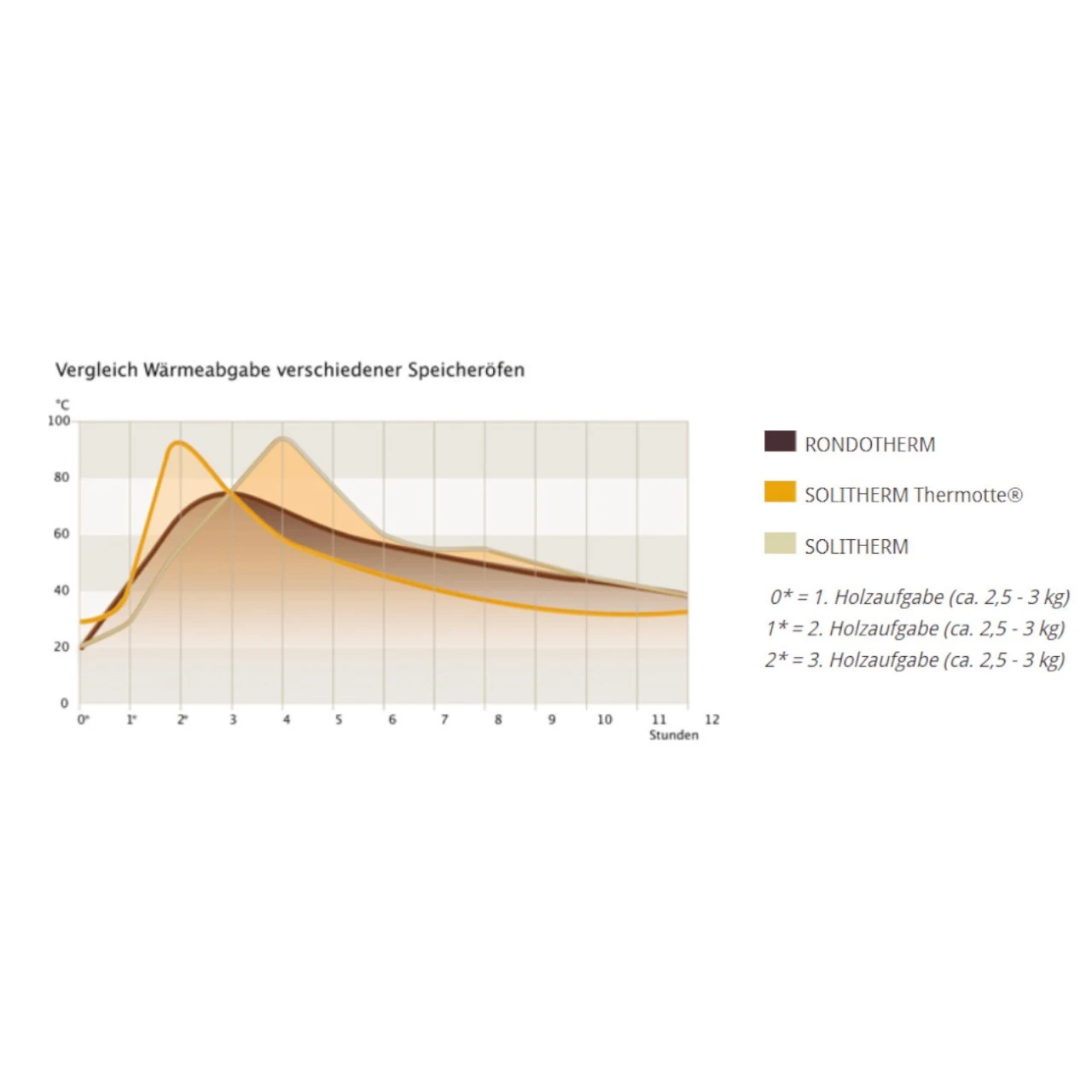- Wärmespeicherfähigkeit: Ja; Dank der Powerstones mit 80 kg Gewicht können Sie die Wärme bis zu 10 Stunden speichern, die nach dem erlischen des Feuers wieder abgegeben wird.
