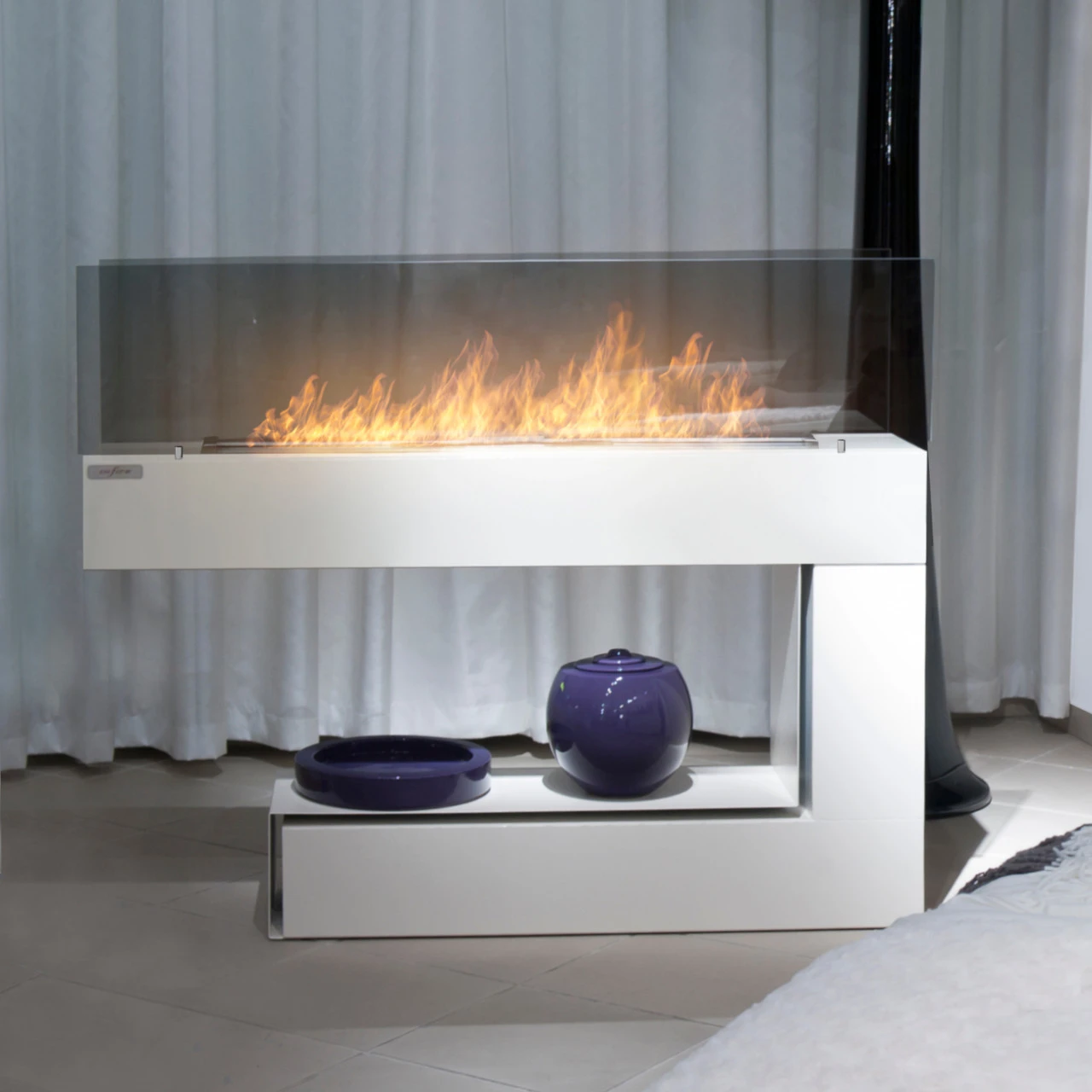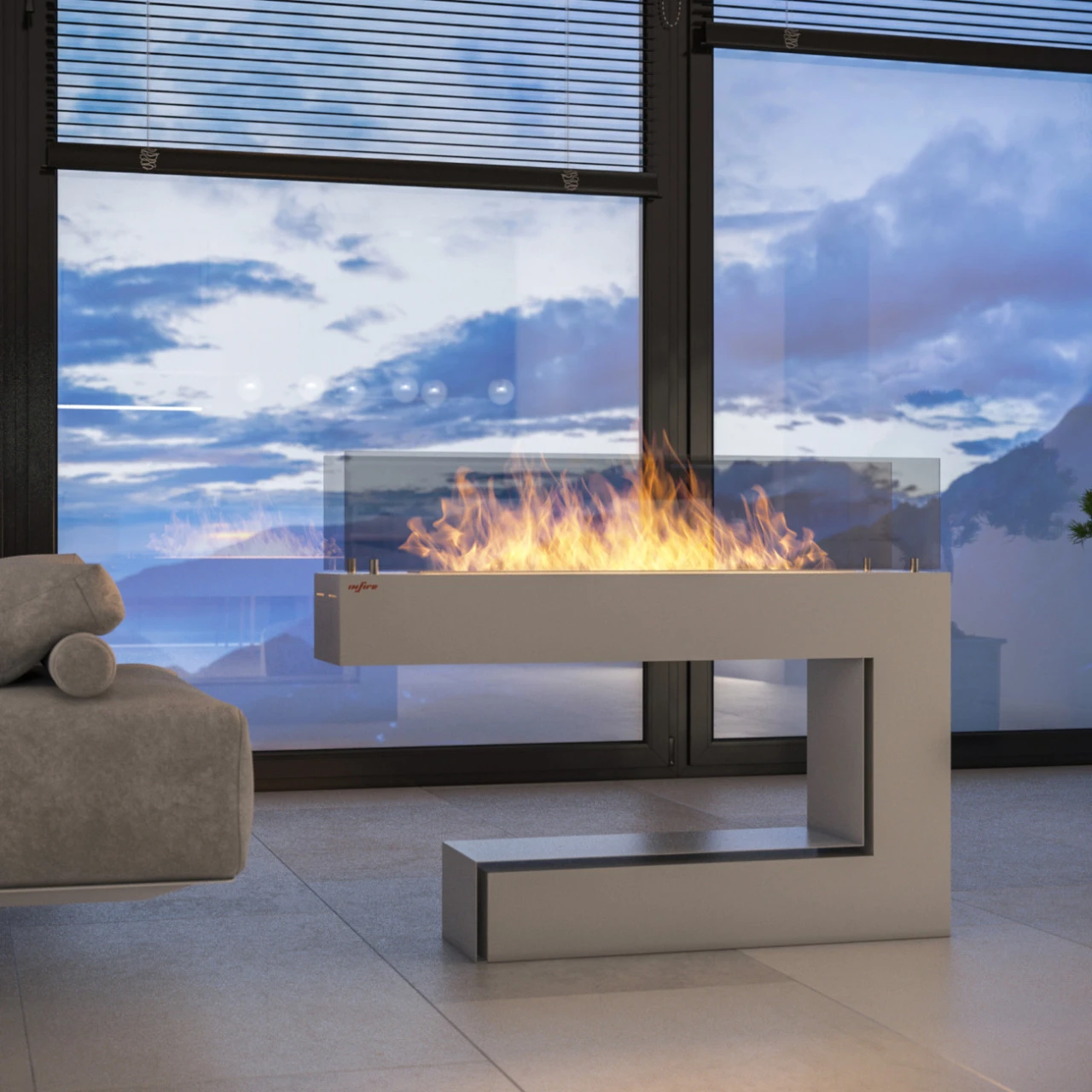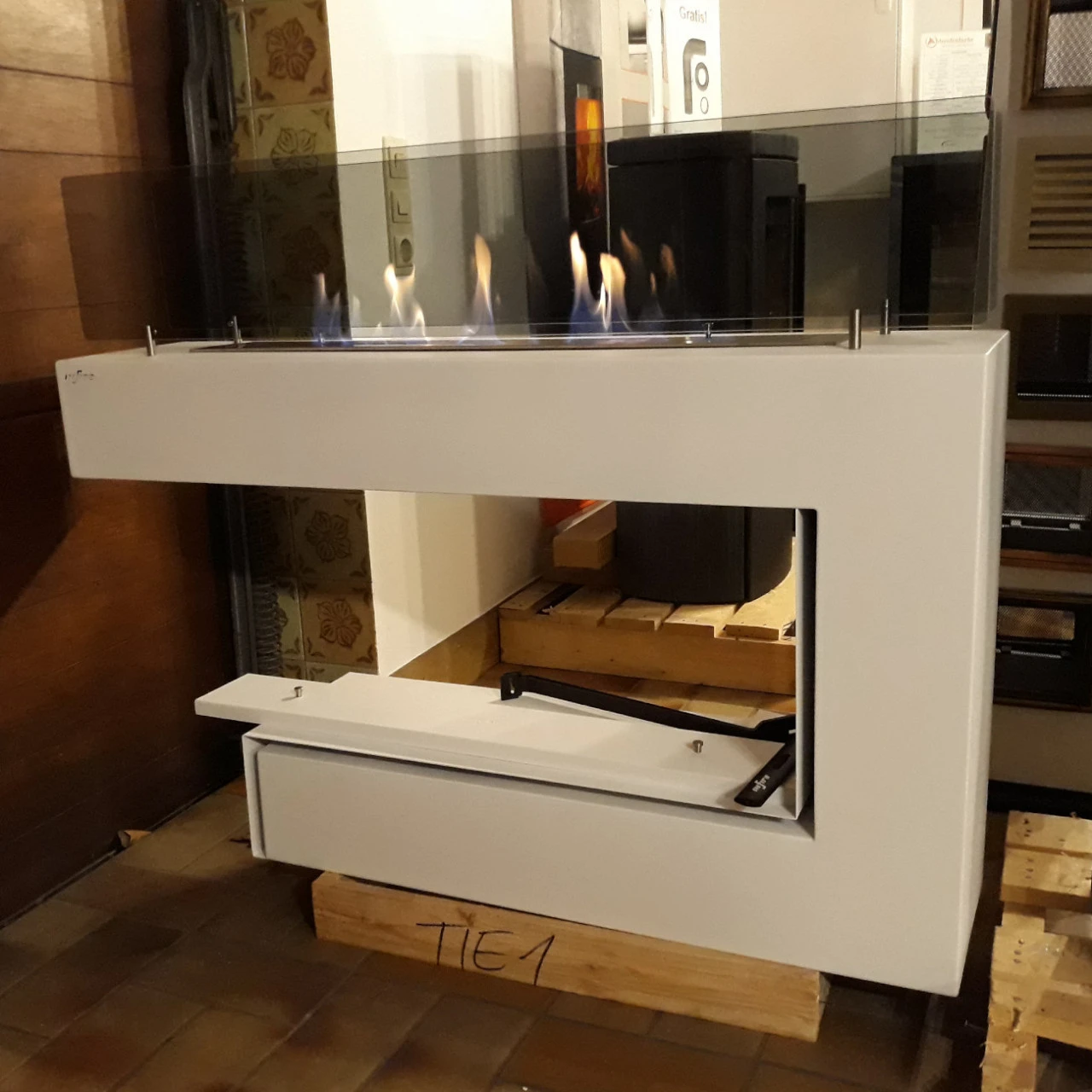„Das Modell Spectrum ist ein freistehender Kamin, der sich durch modernes Design auszeichnet. Seine einzigartige Form fügt sich perfekt in den Innenraum ein, sowohl mit klassischem als auch mit modernem Charakter. Seine Anpassung an den Innenraum kann hauptsächlich durch verschiedene Farben erreicht werden. Getönte (gehärtete) Scheiben lassen die Flamme extrem klimatisch aussehen und sorgen für Sicherheit während des Betriebs. Der Kamin Spectrum wurde so projektiert, dass sein unterer Teil als Regal genutzt werden kann. Der Kamin ist zweiseitig, so dass Sie ihn überall aufstellen können, nicht unbedingt in der Nähe einer Wand. Dadurch haben Sie die Möglichkeit, das Feuer von zwei verschiedenen Seiten oder in zwei verschiedenen Räumen zu genießen.„