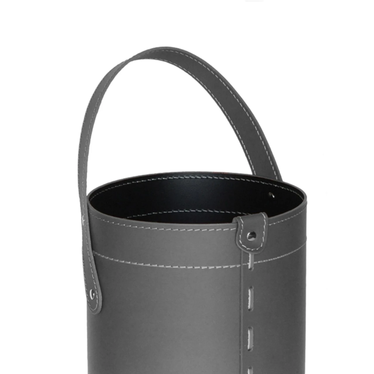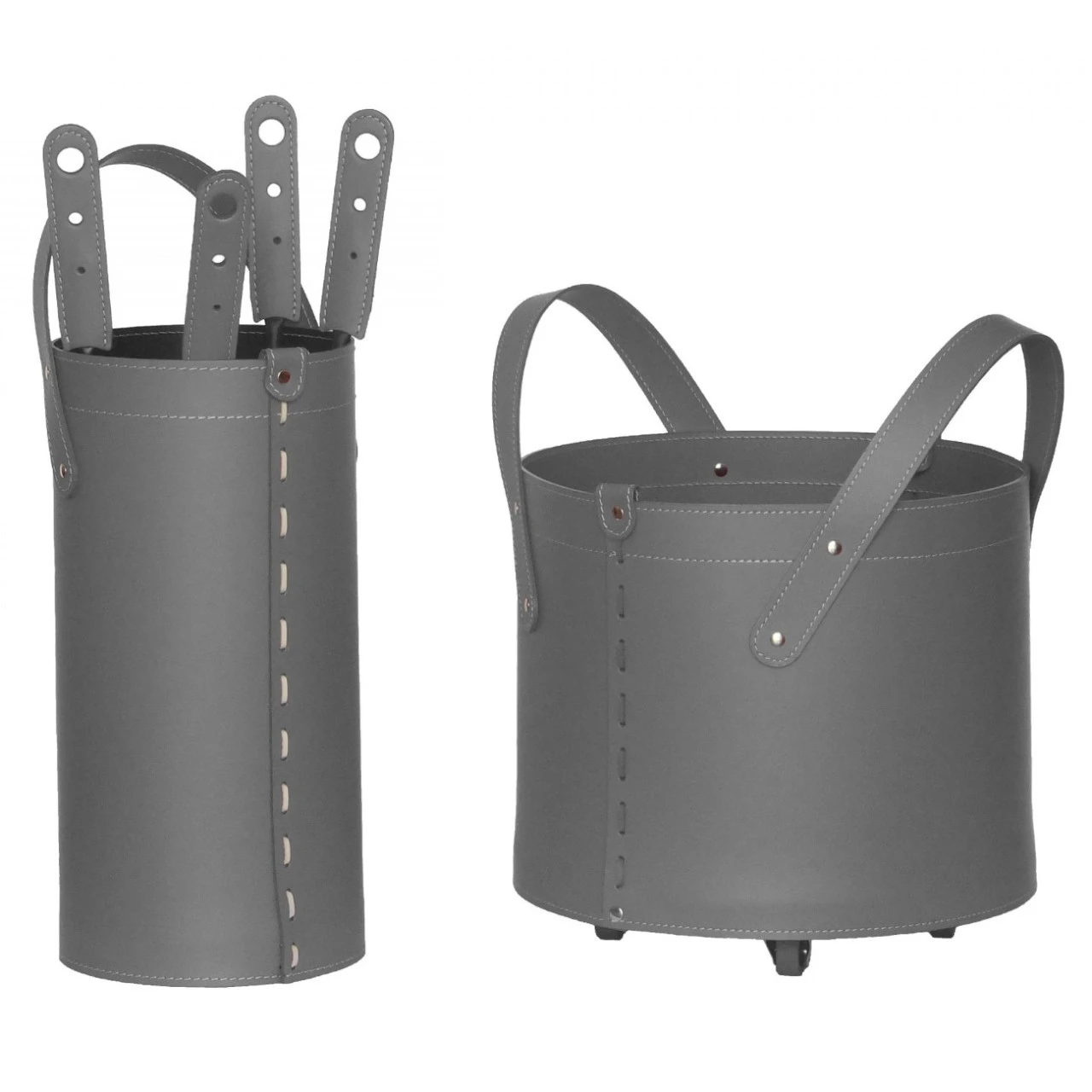 Set bestehend aus Kaminbesteckhalter aus Leder Mod. „Cinta“ und 4-teiliges Kaminbesteck mit Ledergriff Mod. „Mary“. Holzkorb aus regeneriertem Leder Modell Tonda „Mini“
