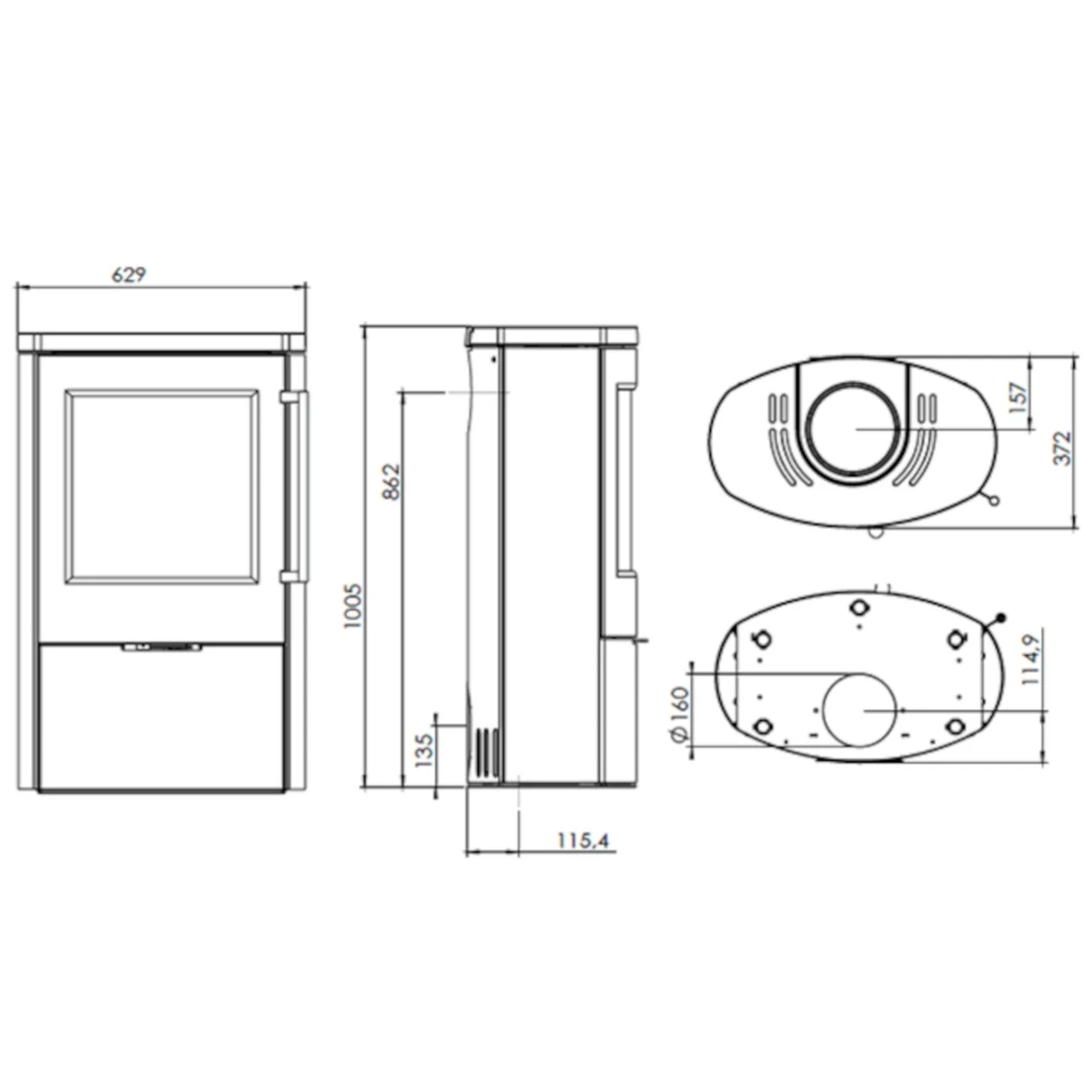- Abstand von Mitte des Rauchstutzens bis zur Hinterkante des Ofens: 15,7 cm;