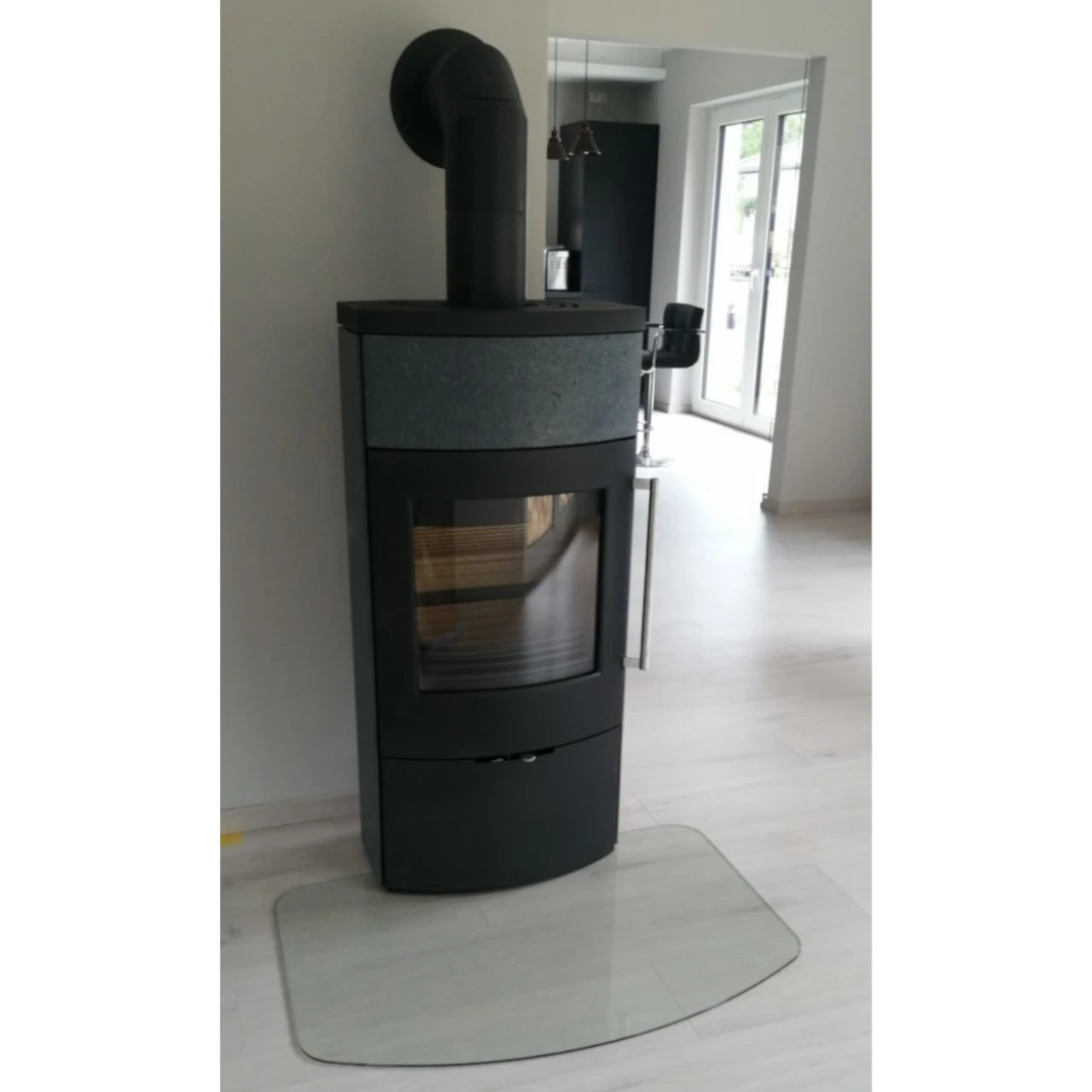 - Formgeschnittene Vorlege-Glasplatte – Die Glasplatte verleiht einen leichten Ausdruck und lässt sich, zwecks Reinigung bzw. Außerhalb der Saison, leicht entfernen. Die verstellbaren Füße müssen vorher am Ofen montiert werden. Die Bodenplatte wird um den Kaminofen gelegt. Der Kaminofen steht auf den Fußboden.