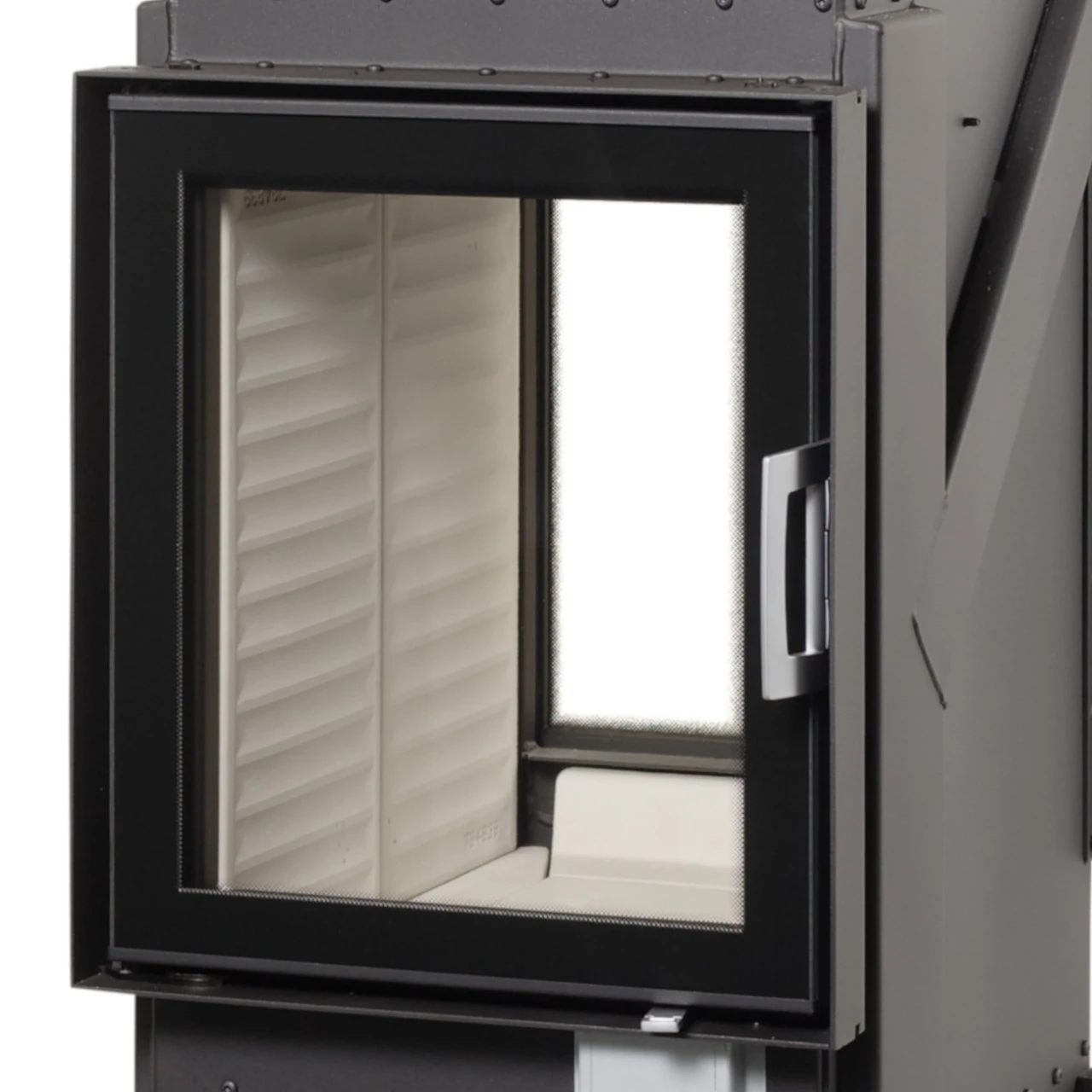 Rostlose Verbrennung: die Holzglut liegt direkt auf dem Boden des Brennraumes. Durch die Innovative Verbrennungsluft wird die Glut hocherhitzt und führt so zu einer fast vollständigen Holzverbrennung. Somit entfällt das Lästige entleeren des Aschekastens