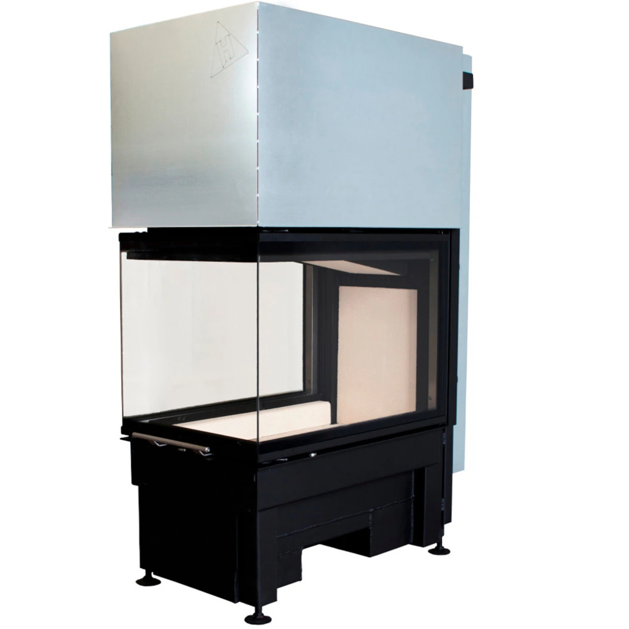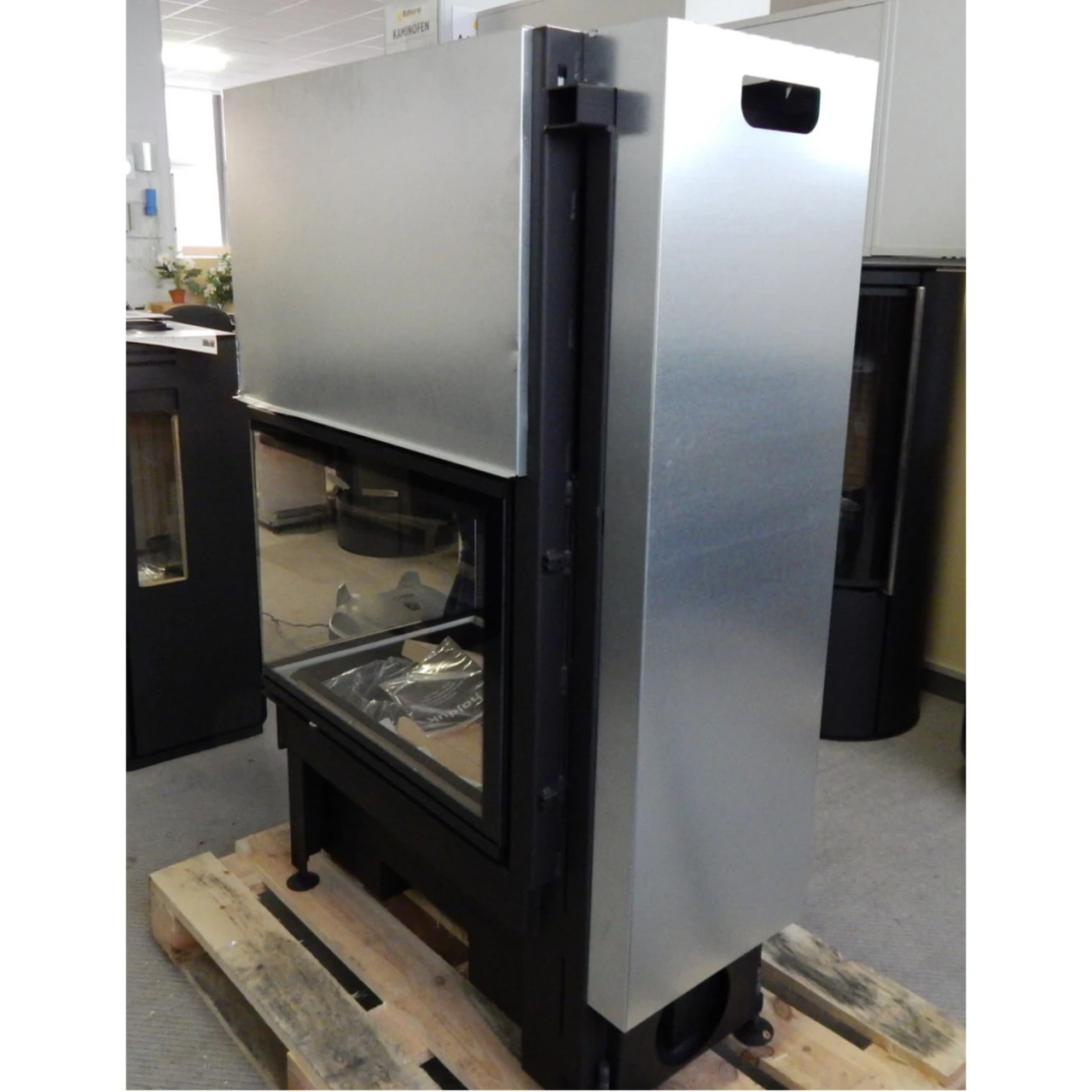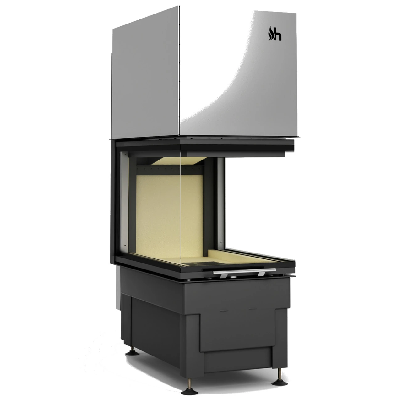 Modell: Hajduk Volcano 3PLUH Warmluft-Eckkamineinsatz, Dreiseitig Verglast und Rahmenlose Hebetür, die Glasscheibe kann geöffnet werden zum reinigen