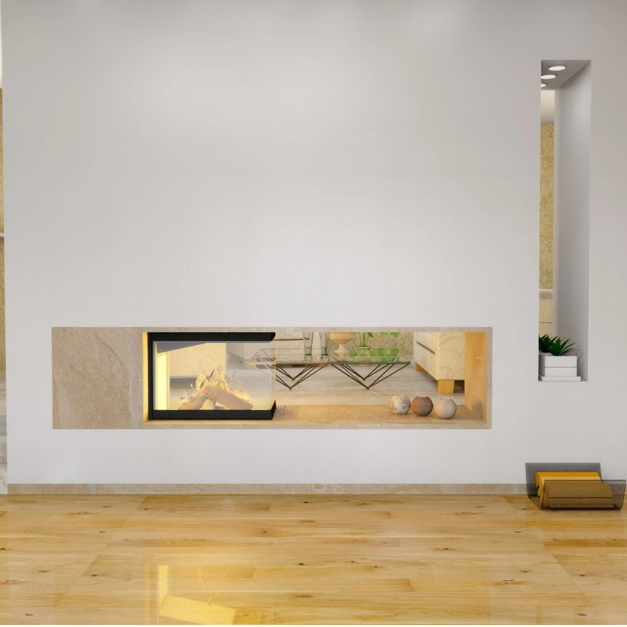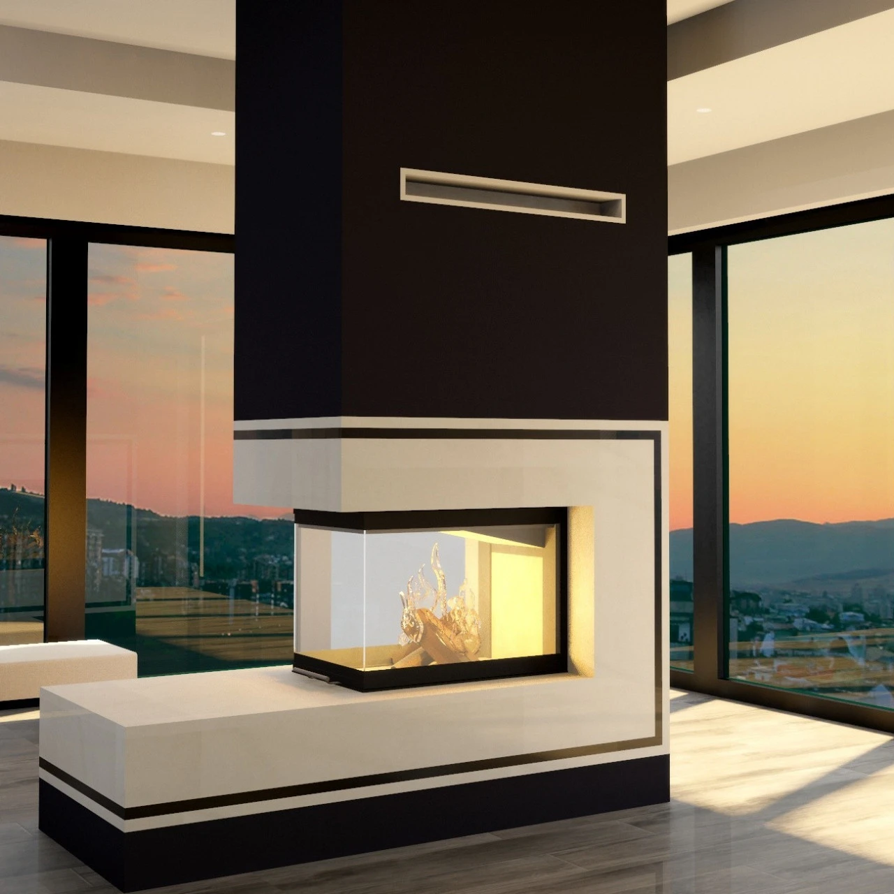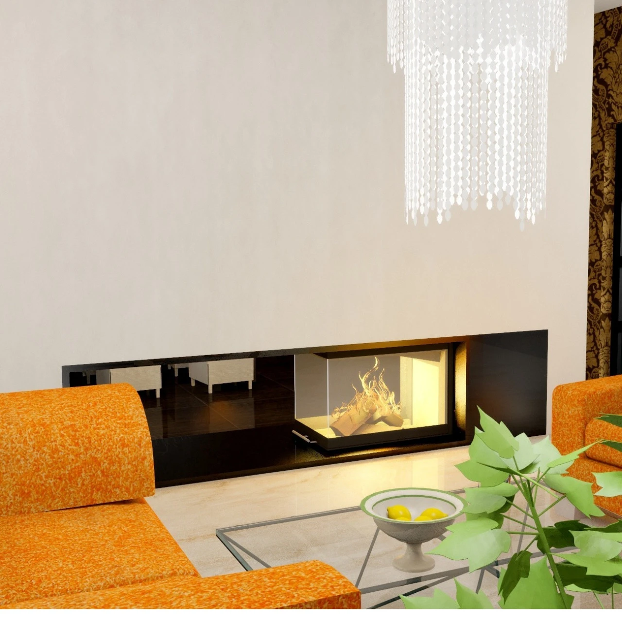 Modell: Hajduk Volcano 3PLUH Warmluft-Eckkamineinsatz, Dreiseitig Verglast und Rahmenlose Hebetür, die Glasscheibe kann geöffnet werden zum reinigen